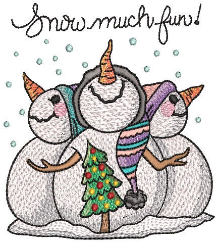 One adorable whimsical snowman design for you! This single design features multiple color layers of lighter density fill to create a blended, variegated, textured look.