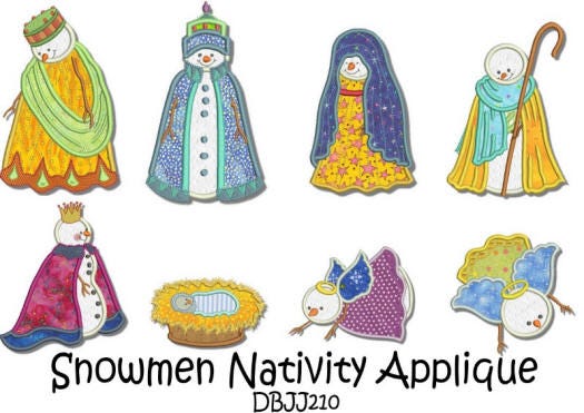 A darling applique set of snowmen depicting the nativity..8 applique designs
