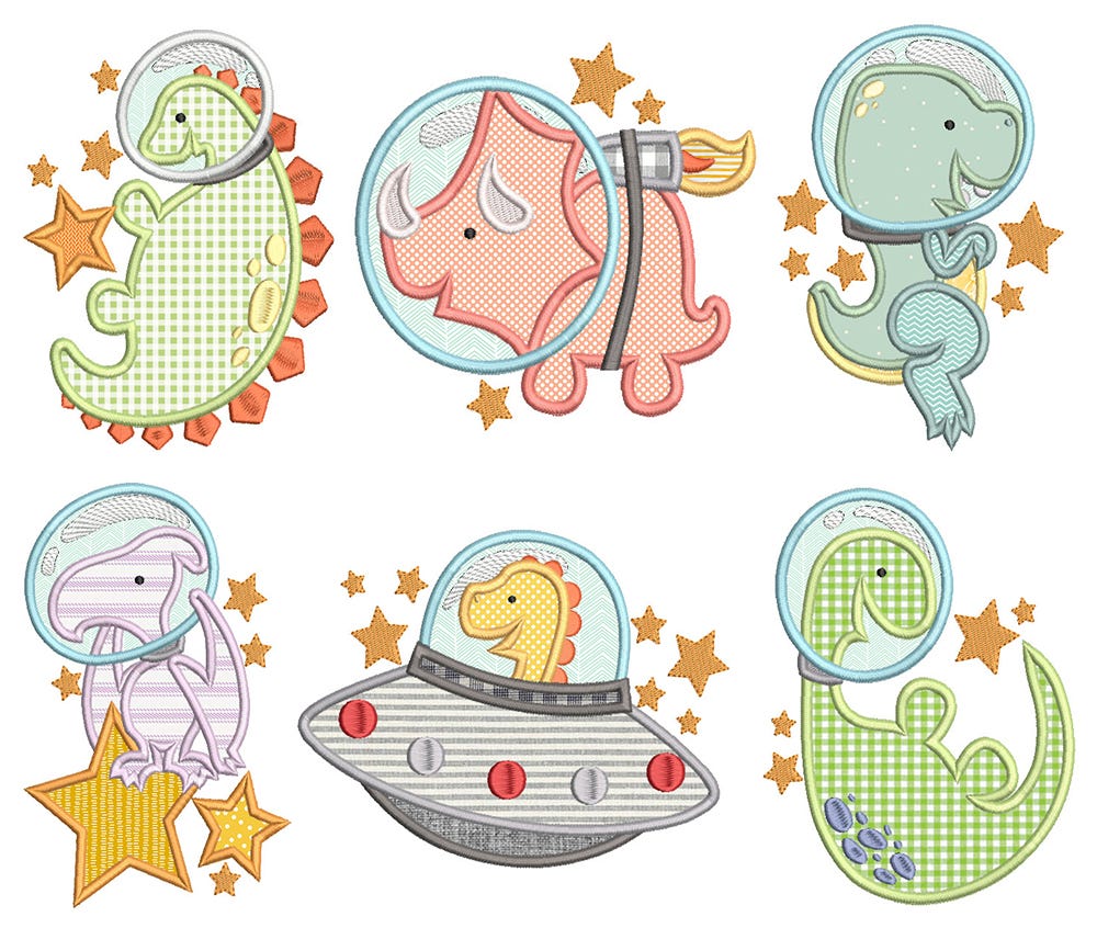 6 out of this world space dinosaurs in applique!
