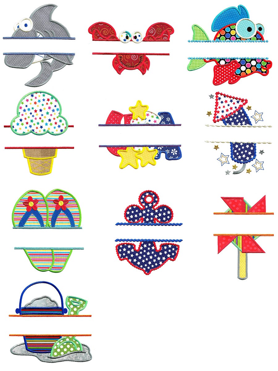 Get ready for some fun in the sun with this wonderful set of 10 different "split" summer applique designs. Great for all summer long as well as several design great for Fourth of July! Ā There are 4 sizes included: Ā 4x4 hoop, 5x7 hoop, 6x10 hoop and 8x8 hoop