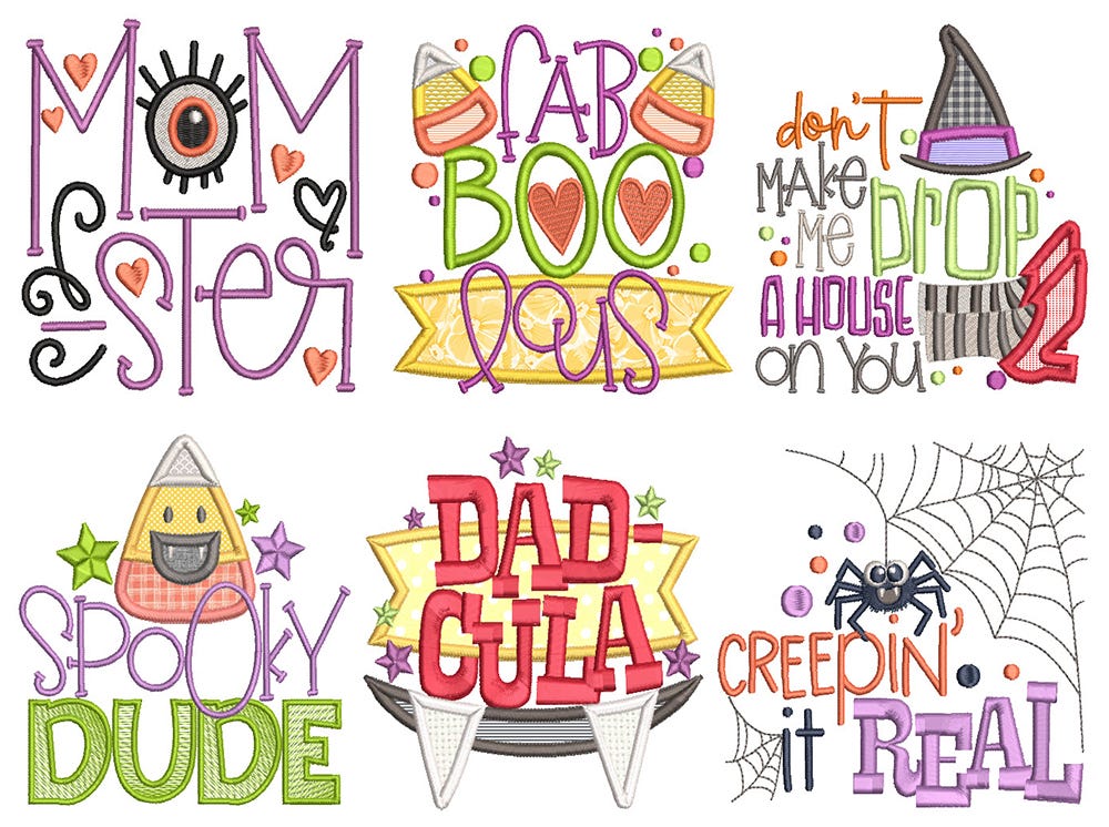 *Please note that the following designs contain applique components:Ā Fab boo lous / Don't make me drop a house on you / Spooky dude / Dad gula /Ā