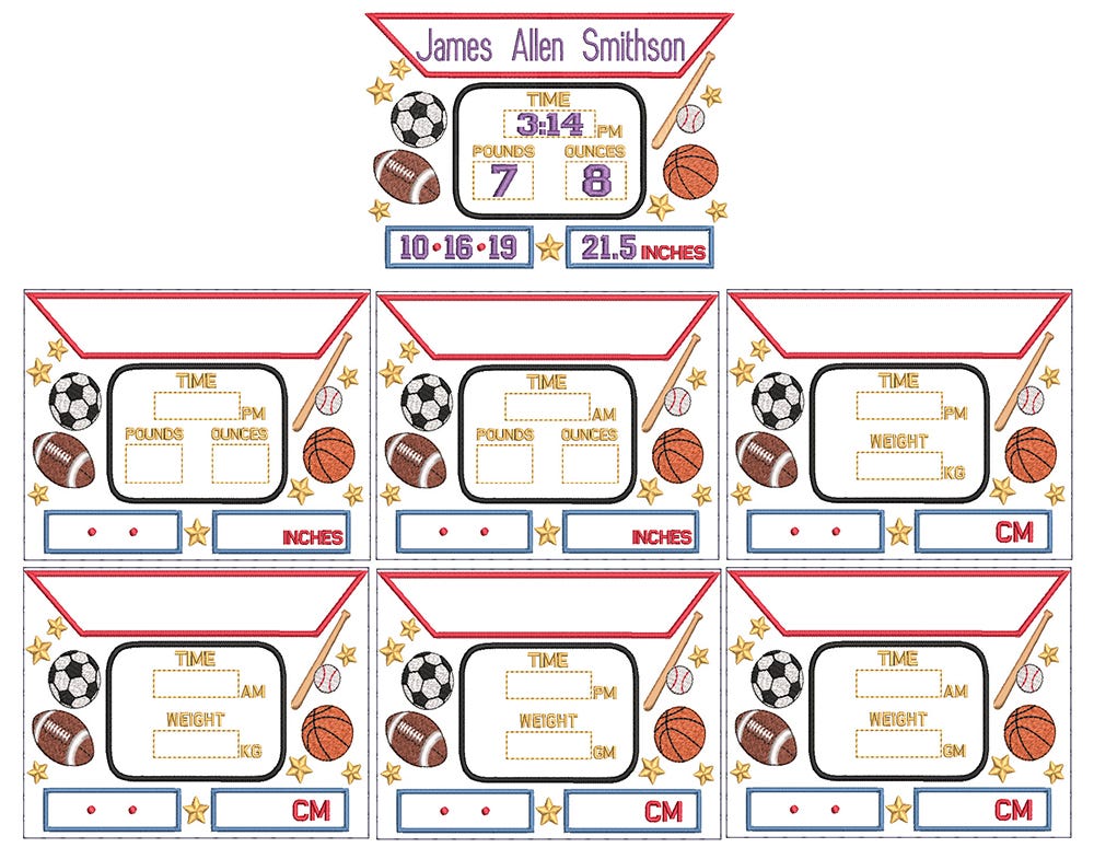 You will receive the embroidery templates shown. Customize with your own names, date, weight and length with fonts from your purchased collection or those that are built in to your embroidery software.Ā I have included a "basting" stitch as the first step so that while you are customizing in your software, you can ensure to stay with the parameters of your hoop. Skip the first step upon stitching.