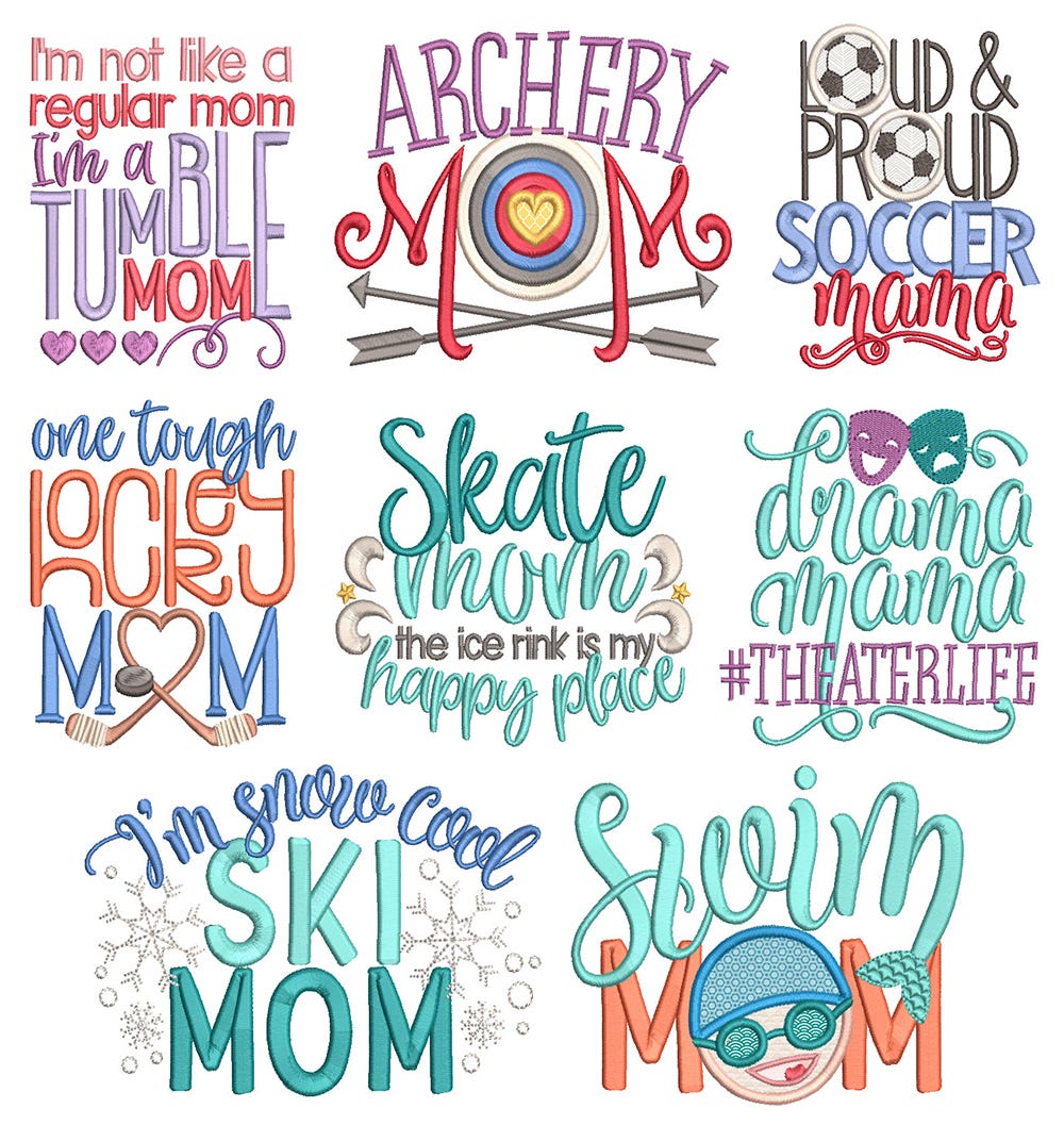 *Please note that the following designs contain applique components:Ā Archery mom / Loud and proud soccer mama / Swim mom /Ā