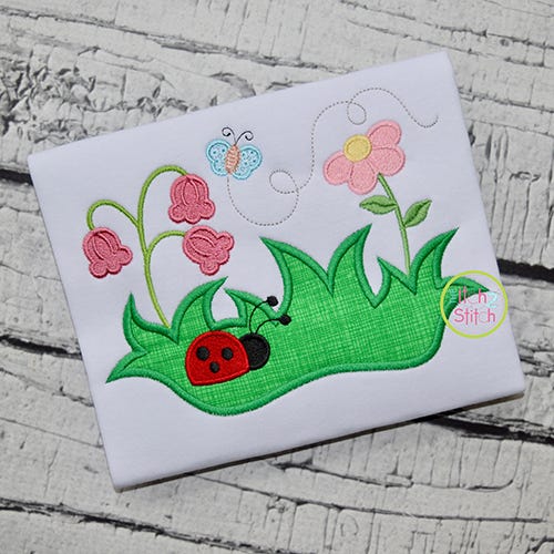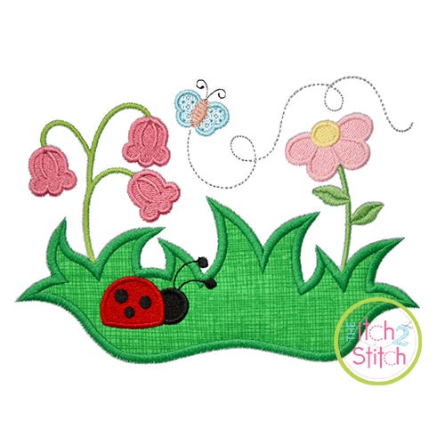 This is a one-fabric applique design (grass). The ladybug and flowers are fill stitch; the butterfly is a motif stitch.