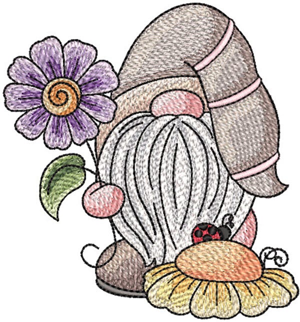 This spring gnome holding a flower has a ladybug visitor!