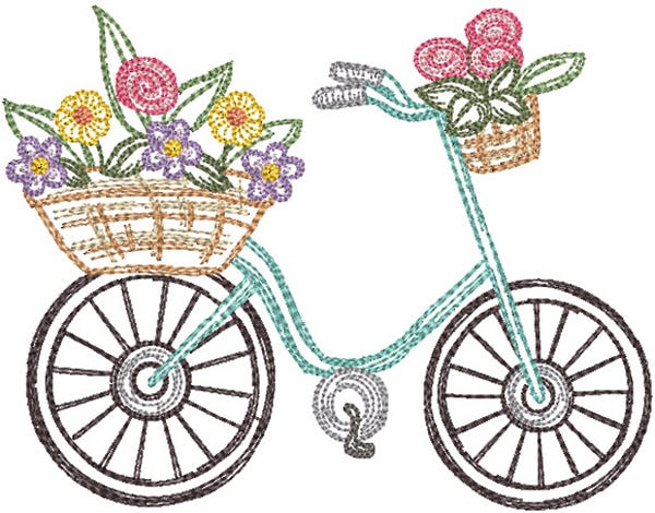 Pedal into spring ~ this bicyle has baskets loaded with flowers! This design is perfect for vintage spring projects. This single is a bean stitch design for a hand-stitched look.