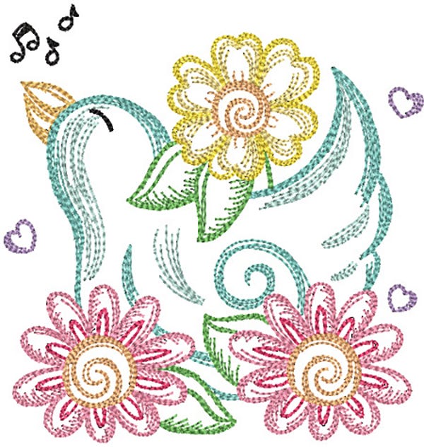 Sing a song of spring! This sweet bird design is perfect for vintage spring projects. This single is a bean stitch design for a hand-stitched look.