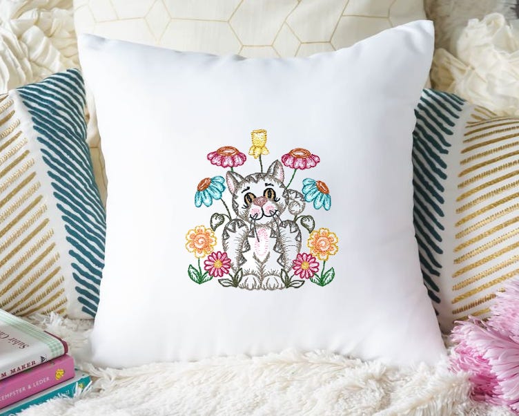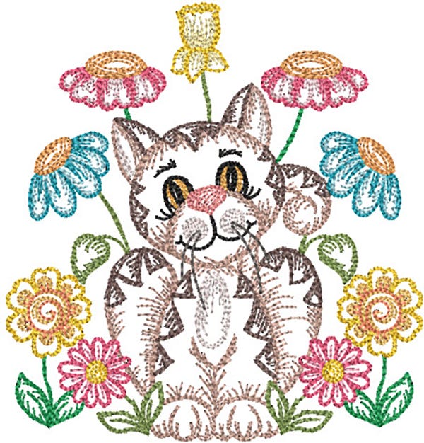 A sweet kitten is seated among the flowers to welcome you to the garden! This design is perfect for vintage spring projects. This single is a bean stitch design for a hand-stitched look.