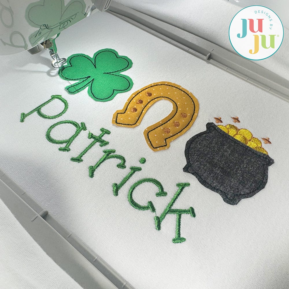 "Patrick" sample shows our Tippy Toes Embroidery Font and three designs from this set.