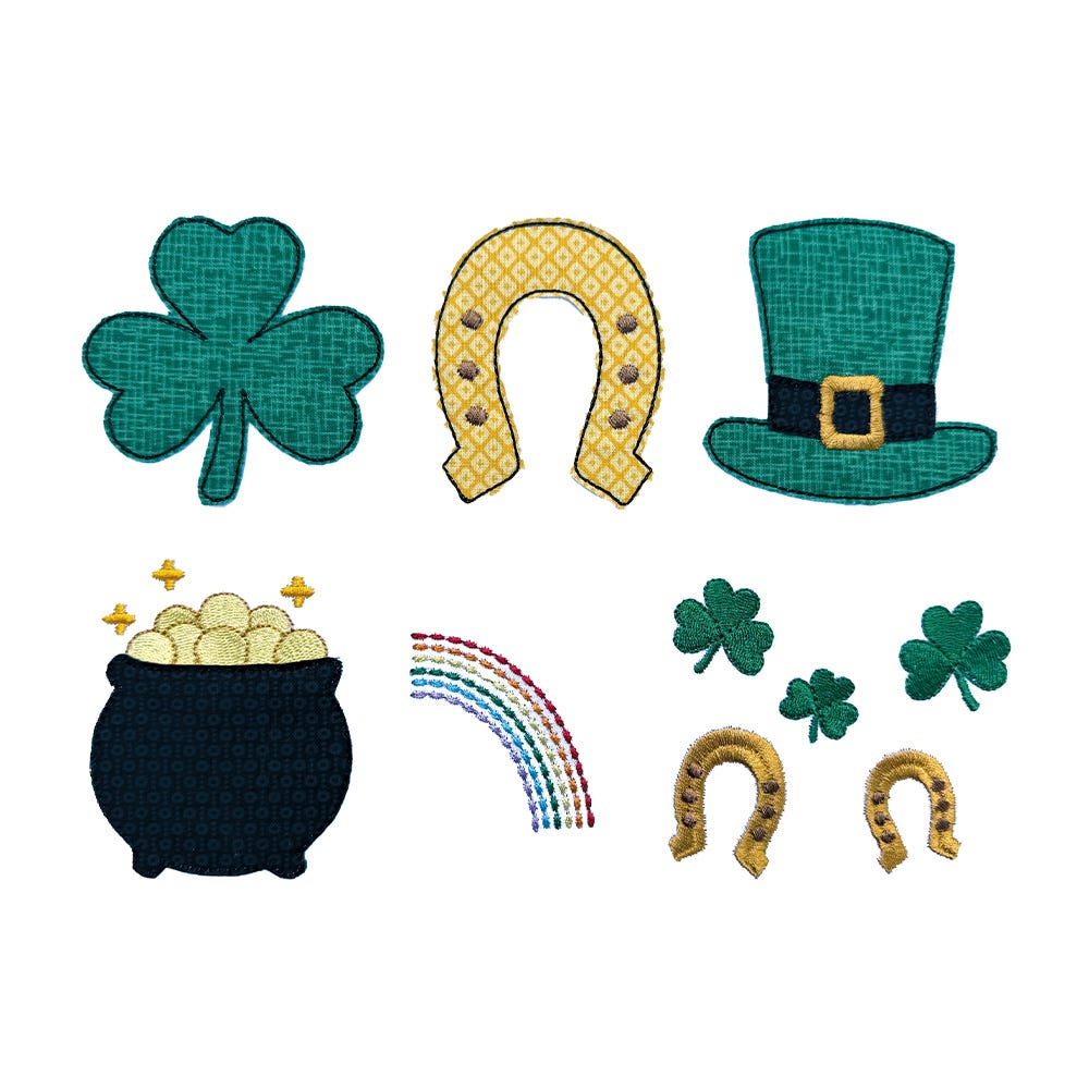 This St. Patrick's Alphabet Embellishment Kit includes 4 appliques: (Leprechaun Hat, Horseshoe, Pot of gold - a combo of applique and embroidery, Shamrock) and 6 embroidery-only accents (Horseshoes in small and large, Shamrock in small, medium and large, Rainbow).