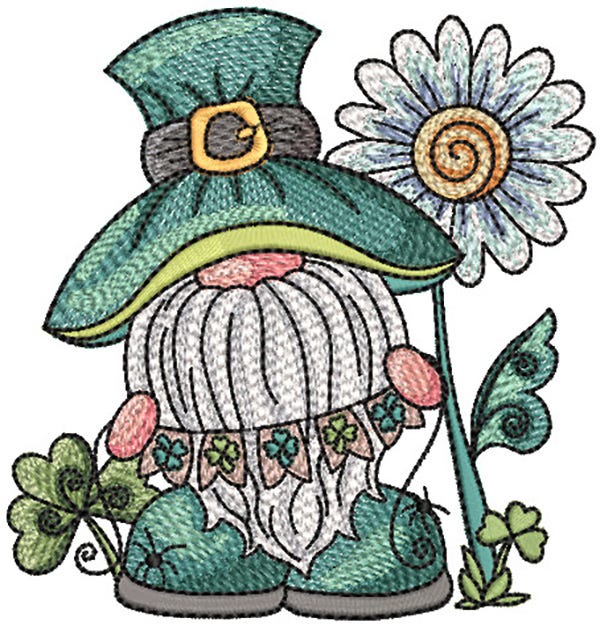 Celebrate St. Patrick's Day and spring with this gnome and daisy design! 4x4 and 5x7 hoop sizes included. This single design features multiple color layers of lighter density fill to create a blended, variegated, textured look.