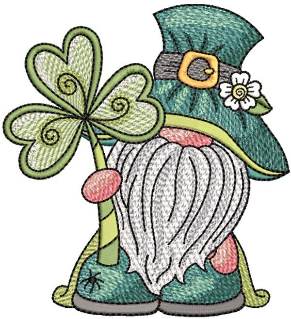 This gnome is sharing the luck of the Irish with a large shamrock! 4x4 and 5x7 hoop sizes included. This single design features multiple color layers of lighter density fill to create a blended, variegated, textured look.