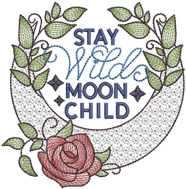 Stay Wild Moon Child is a single design featuring a blend of sketch and motif fills with satin stitch and bean stitch lettering.