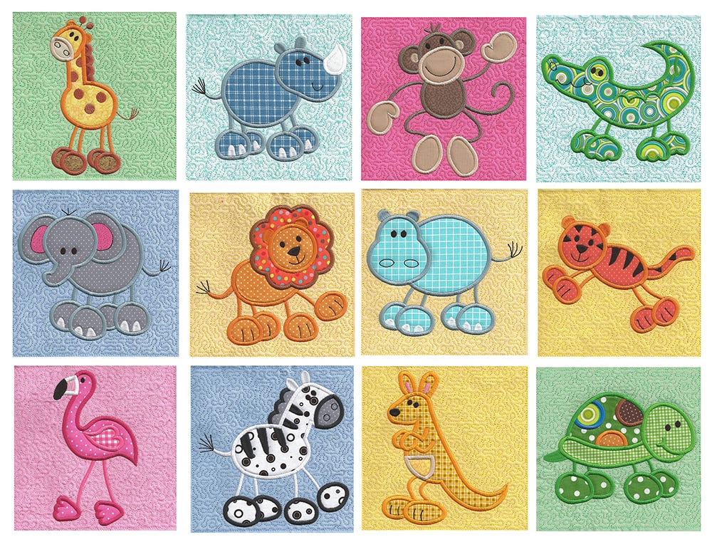 12 adorable "stick" zoo animals in applique. Each design comes in 3 different applique-only sizes and also with the background stippling in blocks..4 sizes. Margie stitched these all out with different color backgrounds and I think they are darling!