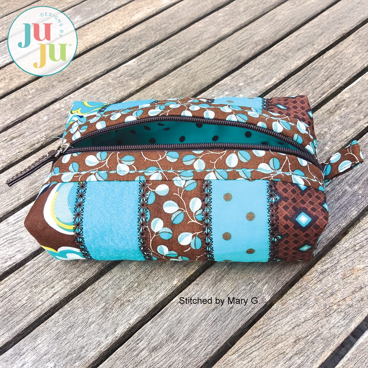 This boxy, top zippered bag is only partially completed in the hoop. The fabric panels are pieced together in the hoop and then get attached to the zipper during a third hooping. The seams of the fabric strips are decorated with embroidery stitches that look hand stitched. The inside is fully lined; no seams are visible. This bag requires three simple hoopings. The boxing of the bag, the seams, as well as the side tabs are stitched on the sewing machine. Some sewing experience is highly recommended. Not advisable for beginners in machine embroidery.