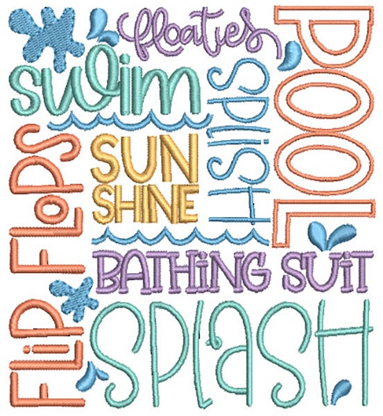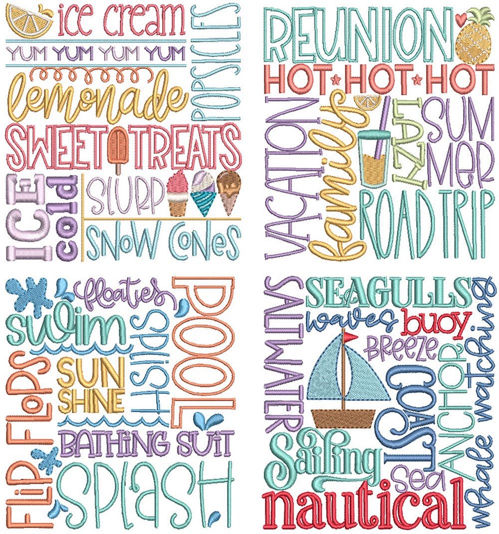 4 more fun summer themed subway art designs! These embroidery-only designs have satin stitch lettering with satin and fill stitch design accents.