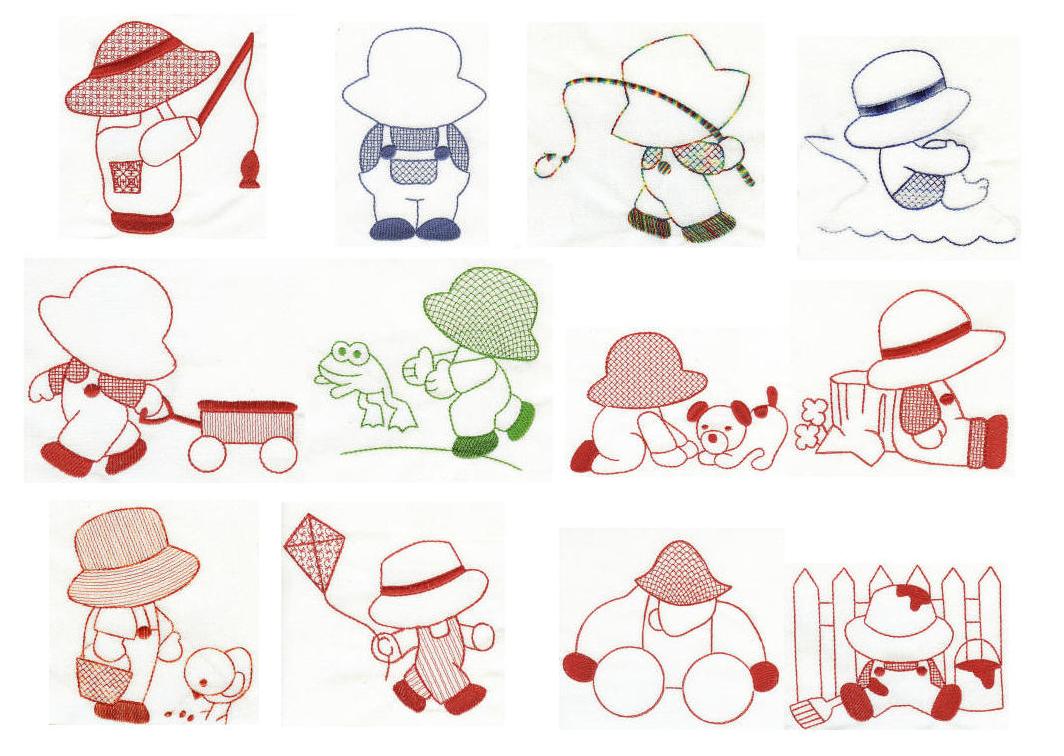 Here is a set of sweet Sunbonnet Sam redwork for the 5x7 hoop..another much requested set since the release of our Sunbonnet Sam redwork in 4x4, many have asked for a larger set.Ā Voila! **all of the designs are redwork or "one color"...some are just sewn out in different colors or varigated thread to demonstrate variety.