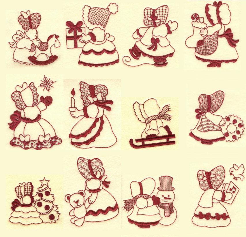 Here are some wonderful, quick, and effective sunbonnets in redwork for all of you Sunbonnet Sue lovers!Ā
