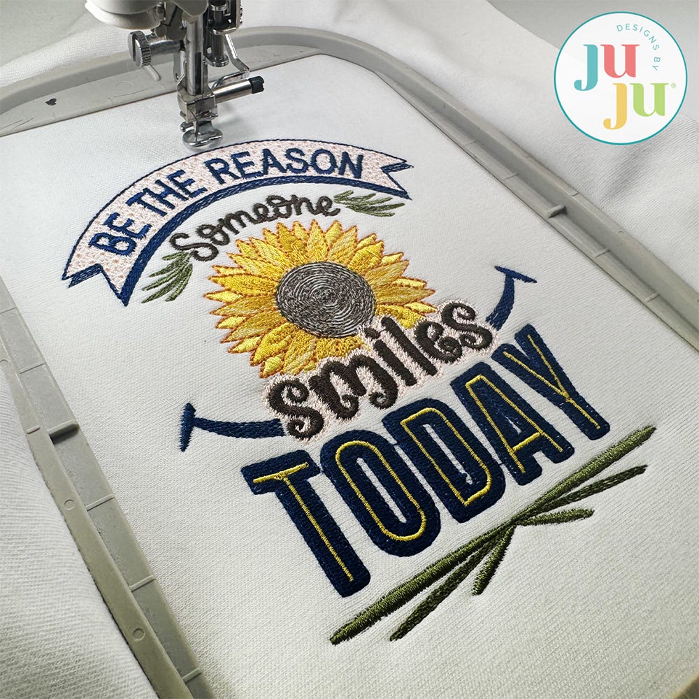 BE THE REASON Someone smiles TODAY - this lovely sentiment is paired with a beautiful sunflower and a smile in our embroidery-only Sunflower Word Art 3 design.