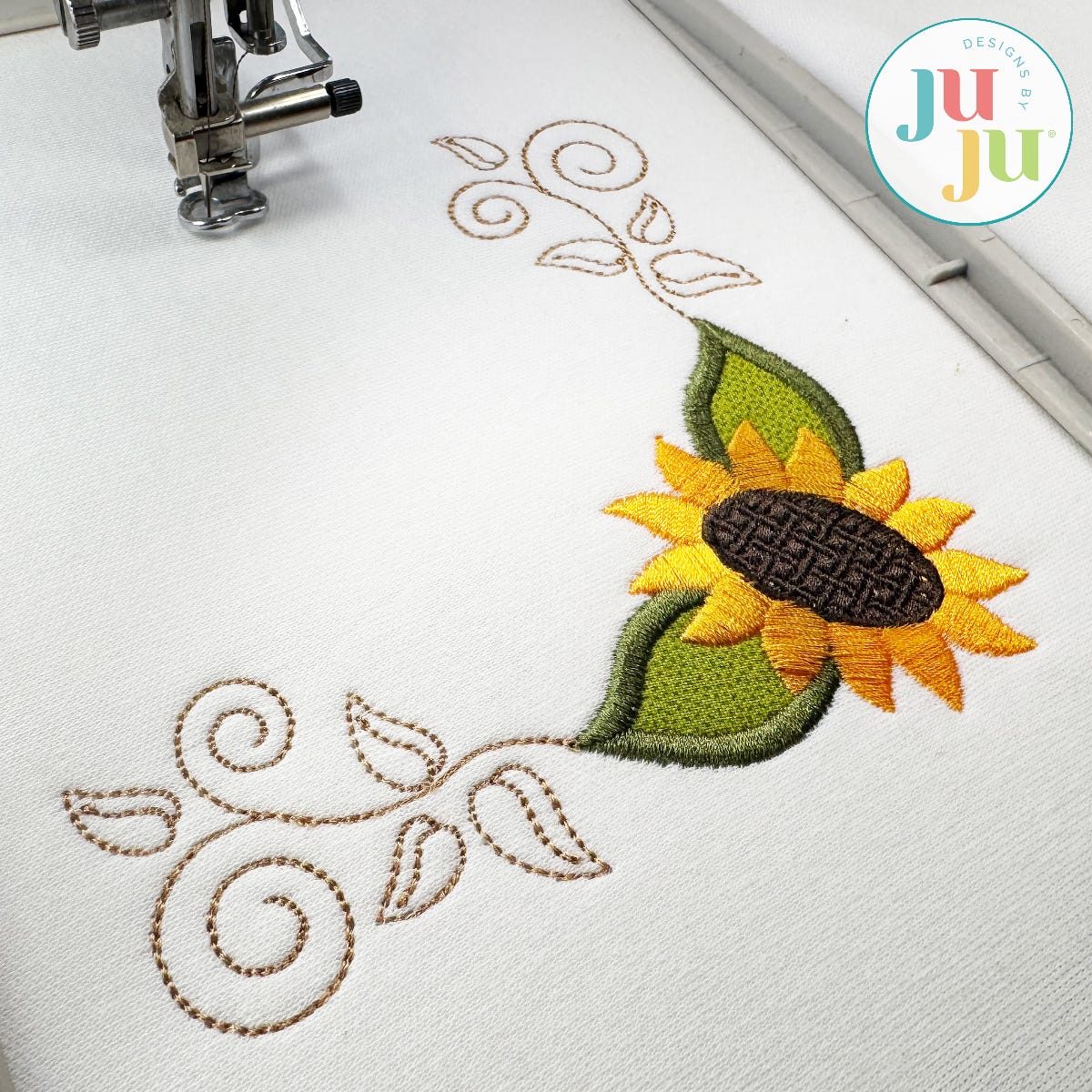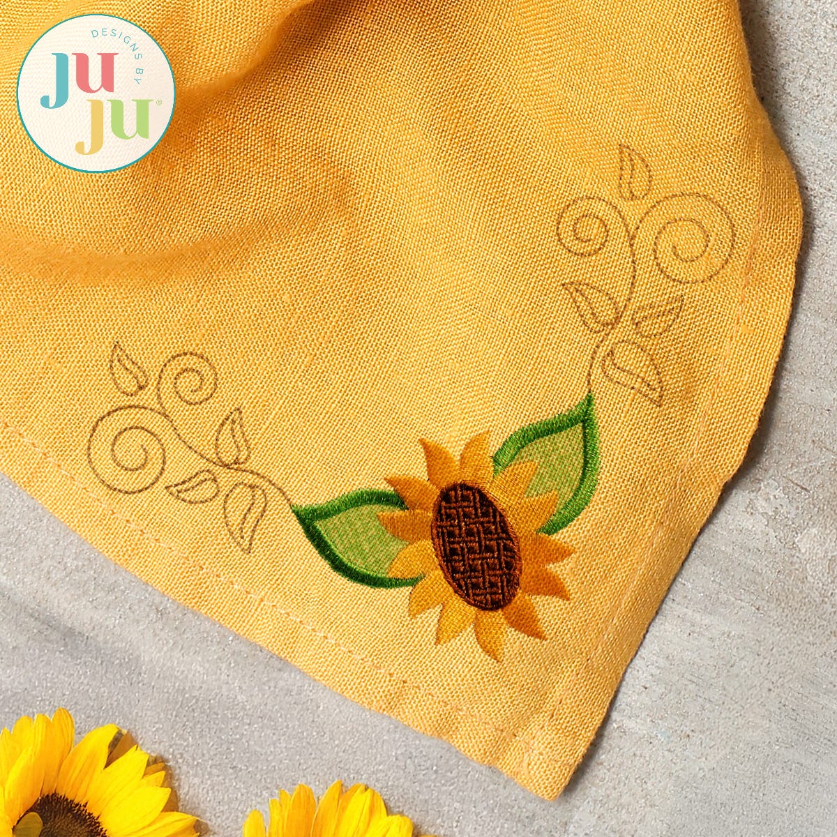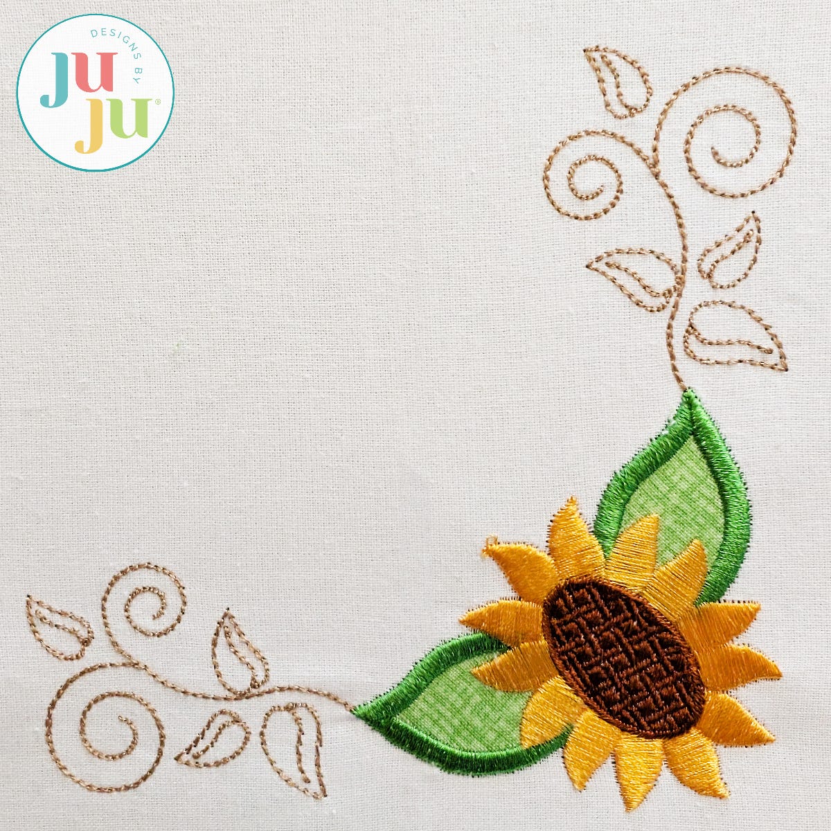 Embellish your items with a splash of sunny floral flair! Our Sunflower Corner design is perfect for table decor and more! The 4x4 size is designed to fit napkin corners. This design features a blend of fill and satin embroidery stitching. Designed to coordinate with our Scarecrow Modular Seasonal projects.