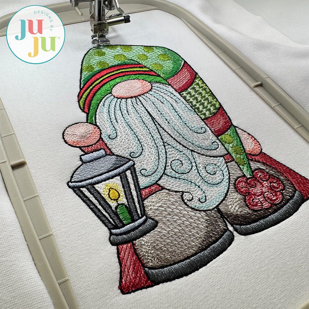 This Santa Gnome looks very cute and cozy with his warm glowing lantern, festive stocking cap, and long swirly beard! This single embroidery-only design features bean stitch outlines as well as multiple color layers of lighter density fill to create a blended, variegated, textured look.