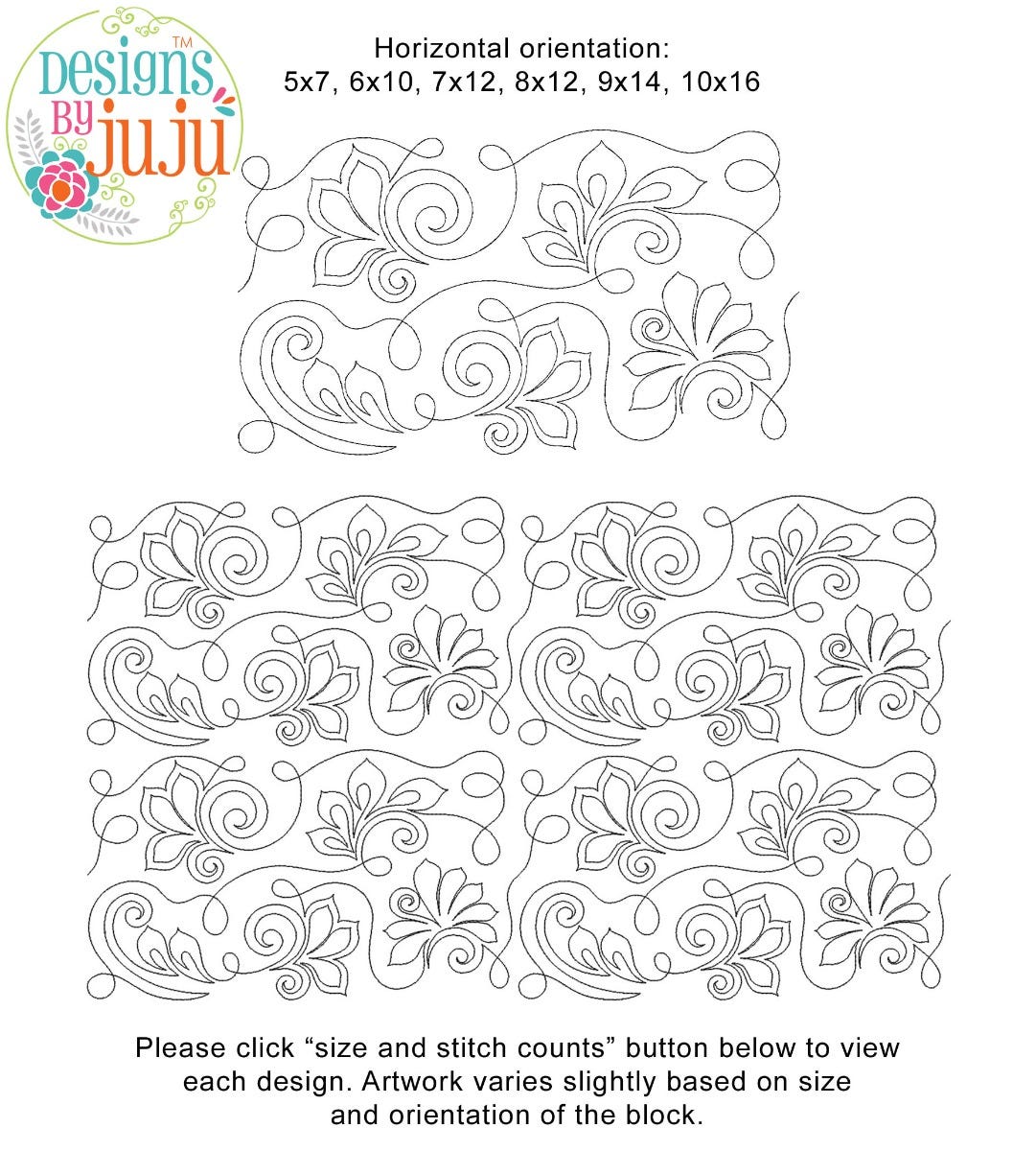 Each one of our End-to-End Quilting™ embroidery designs is an originally created design available in a large variety of block sizes. Every block is one continuous single-run line running edge to edge beginning on the left and exiting on the right. There is NO backtracking or double stitching. Each size block has been engineered and manually digitized by our team for EXACT edge-to-edge quilting precision so that when they are aligned properly in your hoop, you cannot tell where one block ends and the next one begins! ADDITIONALLY, the art has been created for each size so that when the rows are stacked on top of each other, it provides a practically seamless, professional, allover quilting effect that mimics (E2E) pantographs so you can do edge-to-edge quilting on your embroidery machine!