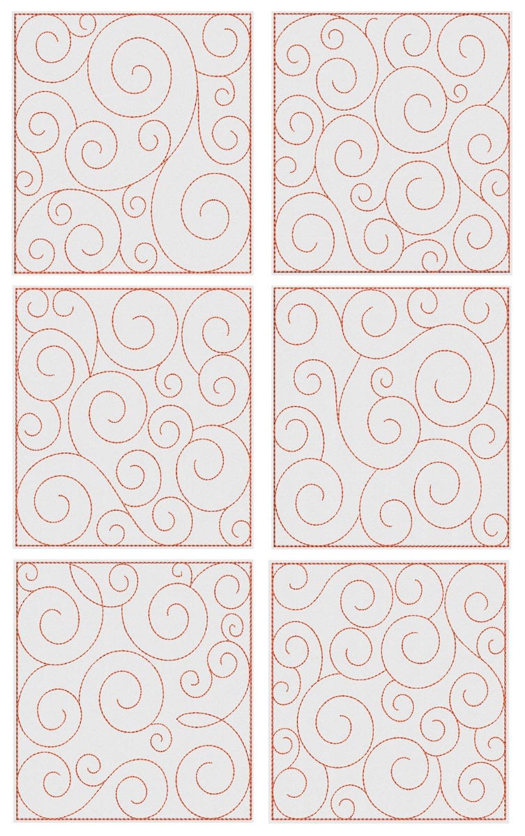 These blocks include placement and tack down steps for batting and fabric. The quilting step a triple bean stitch. Stitch these blocks as-is, or use them as a background quilting for a customized project. Add the design of your choice on top of the swirls pattern for a unique quilt!