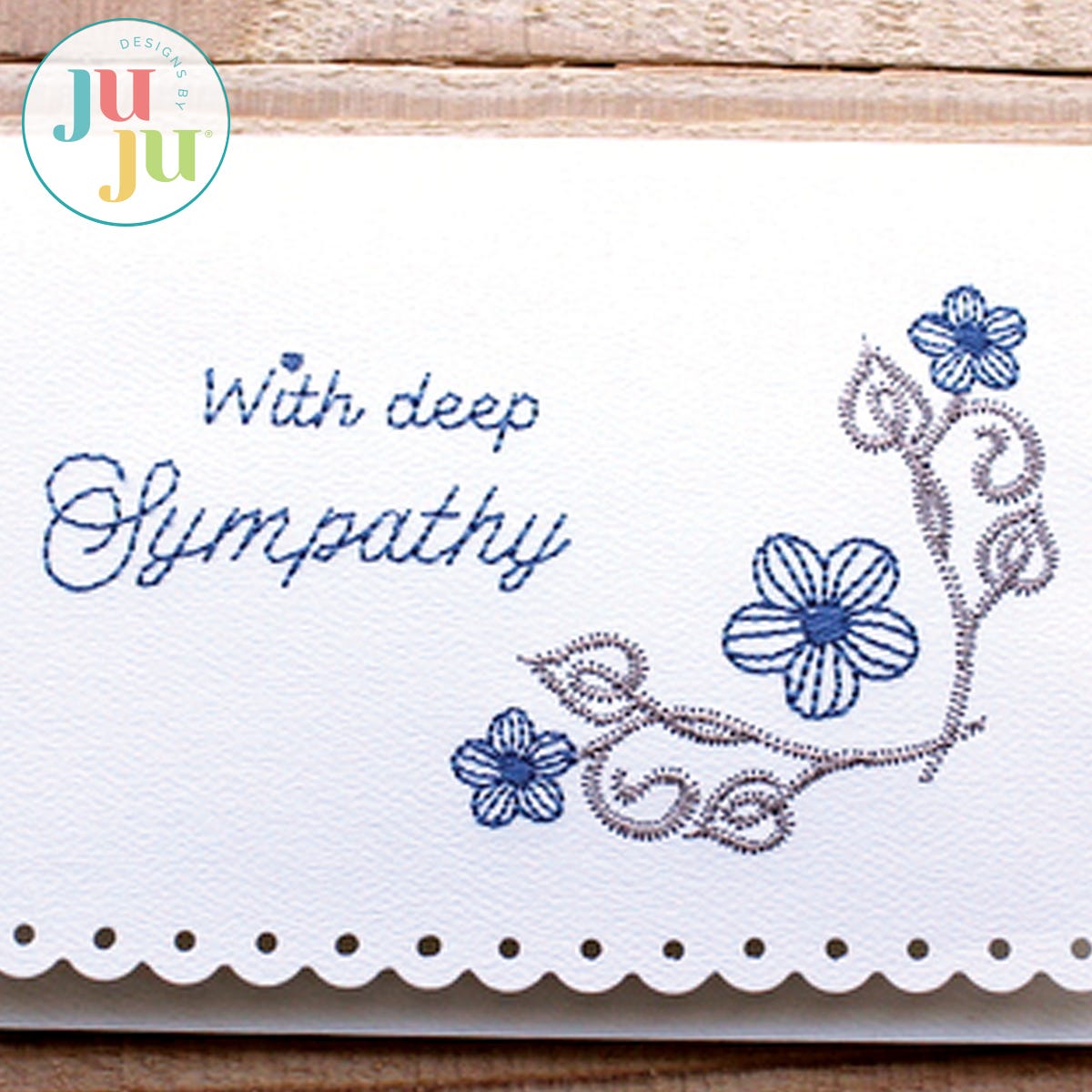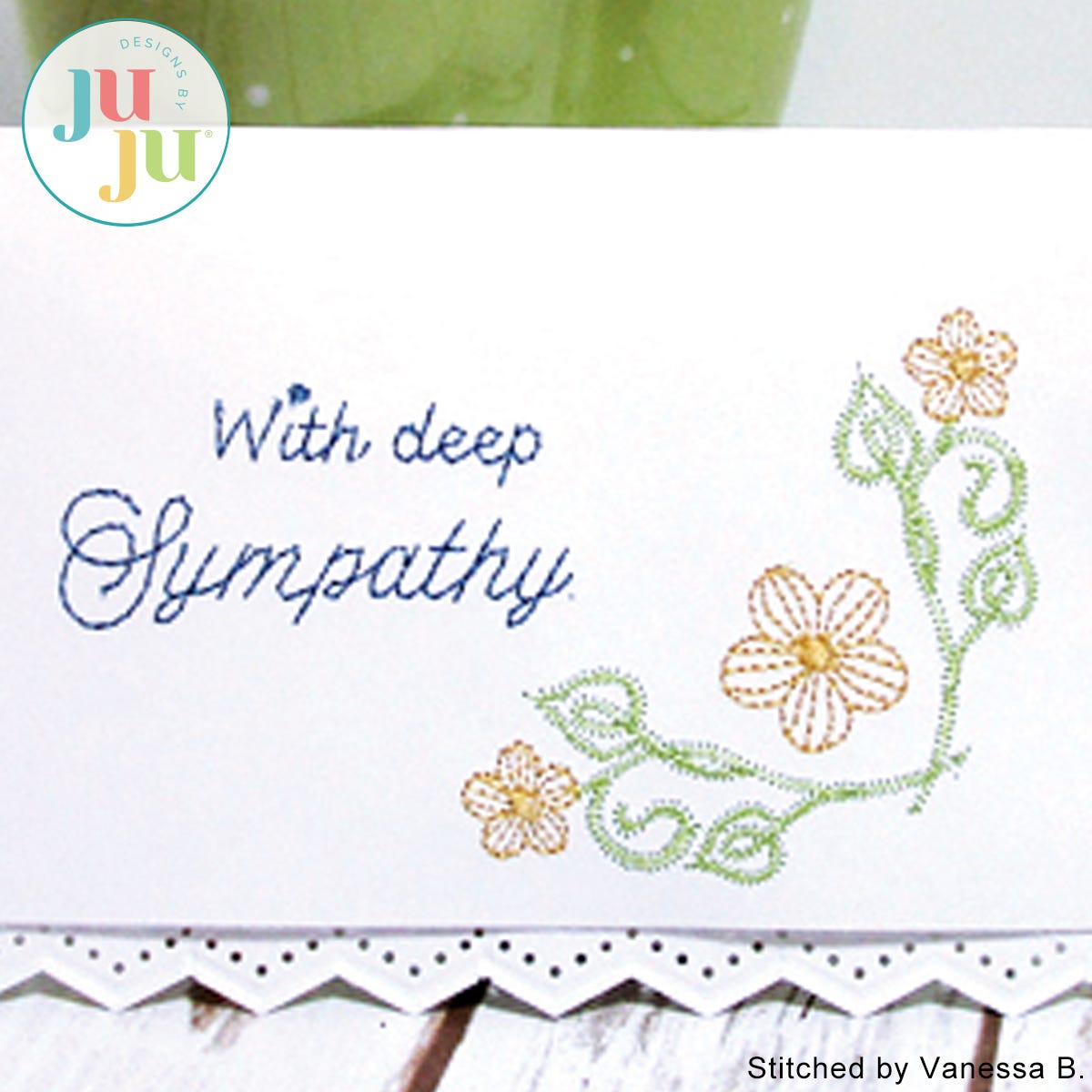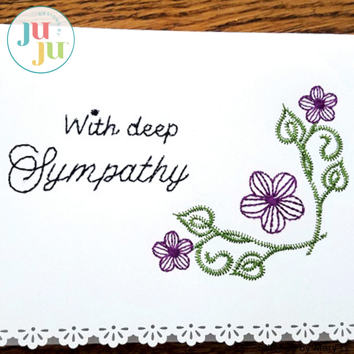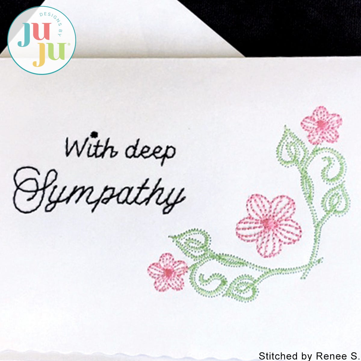 You are receiving 3 stitch files in total: The card design with and without the words "With deep sympathy", as well as the words "With deep sympathy" separately. The card design comes with placement stitches to ensure accurate placement of the design on the card. Instructions include tips on stitching on blank cards or card stock. The card shown was created from regular white card stock and embellished with the use of a corner paper punch. But even without decorative corners, the card looks very attractive.