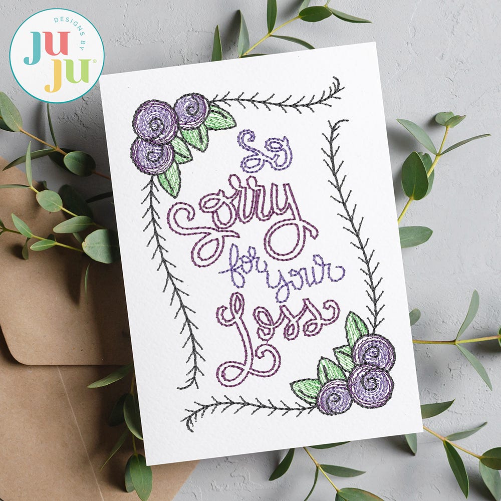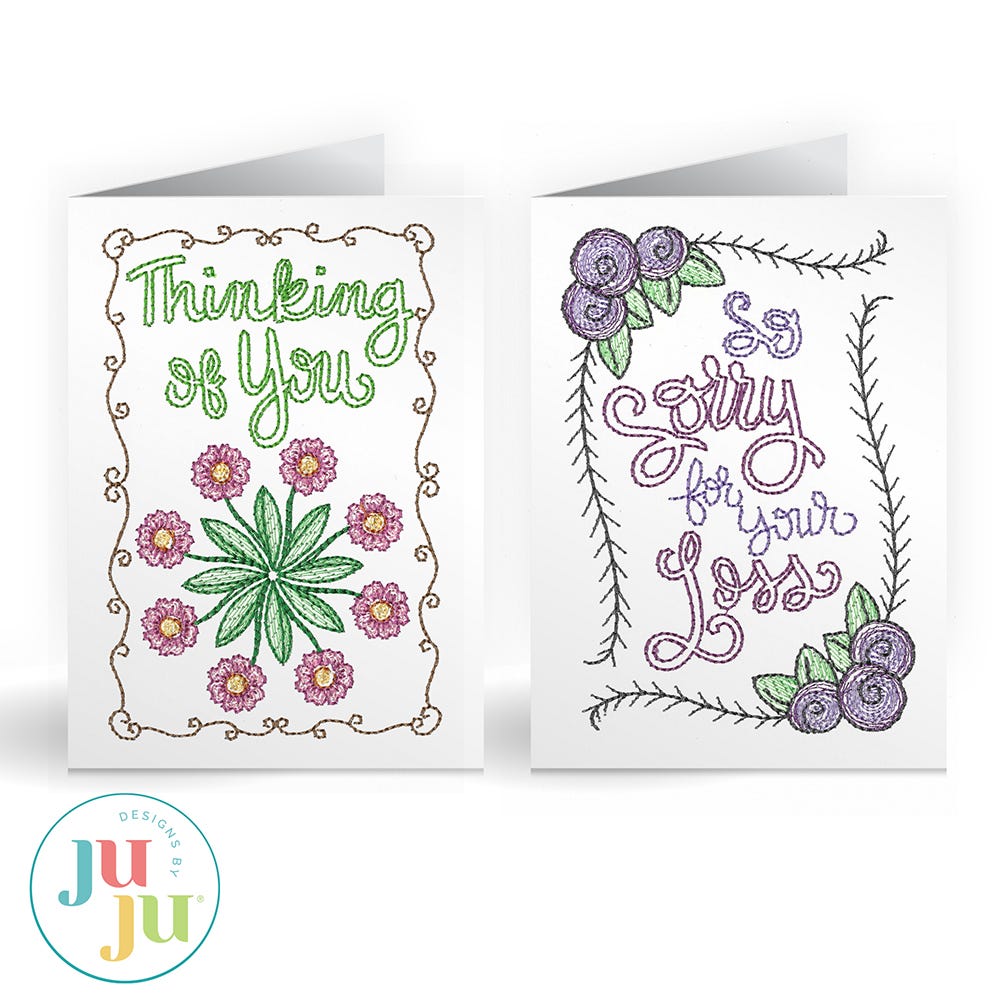 Introducing our Sympathy Greeting Cards 2 embroidery set! This collection includes two beautiful greeting cards adorned with florals and the heartfelt sayings "Thinking of You" and "So Sorry for Your Loss".