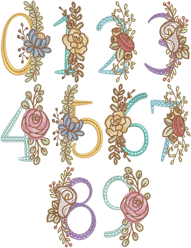 Our Tabitha Number Set is embroidery-only with decorative satin stitch numbers and a floral spray. The satin and bean stitch outlines are intentionally offset from the sketch fills as part of the stylistic artwork, as pictured. Alphabet set also available. See below.