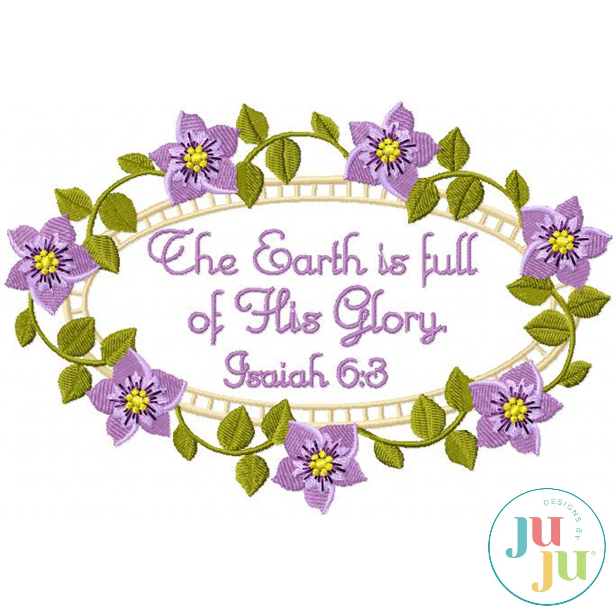 Two designs included: floral frame 'blank' and floral frame with The Earth is full of His Glory. Isaiah 6:3. Beautiful stitched out as a center of quilts, wallhangings, or pillows it also is suitable for framing. Font not included.