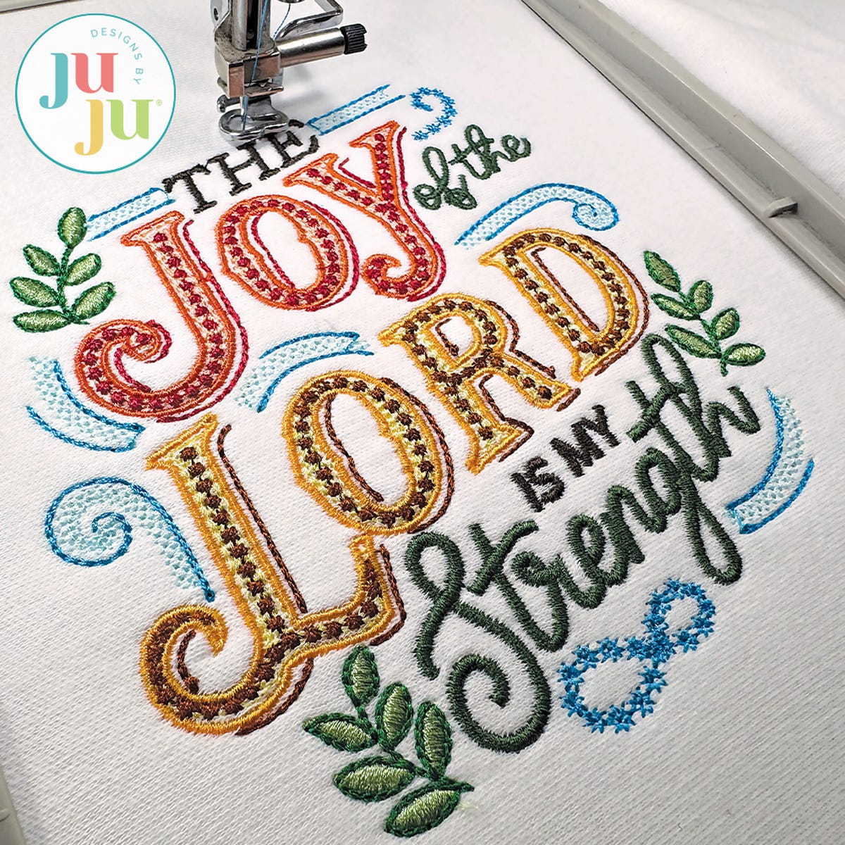 "The Joy of the Lord is my Strength." This single, embroidery-only design features beautiful, biblical word art framed with gorgeous leaves and other decorative accents. A lovely choice for stitching thoughtful gifts, spiritual keepsakes, or peaceful accents for your space.
