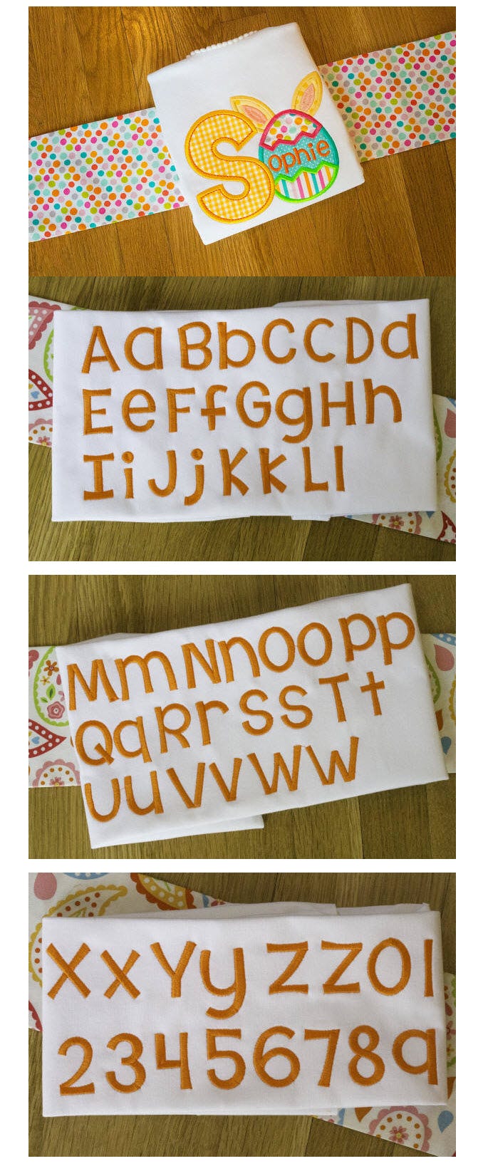 An adorable chunky font that comes in sizes as small as 1/2 inch and includes numbers and characters!! This font matches the applique letters in our Easter Bunny Egg Applique Alphabet (DBJJ653)