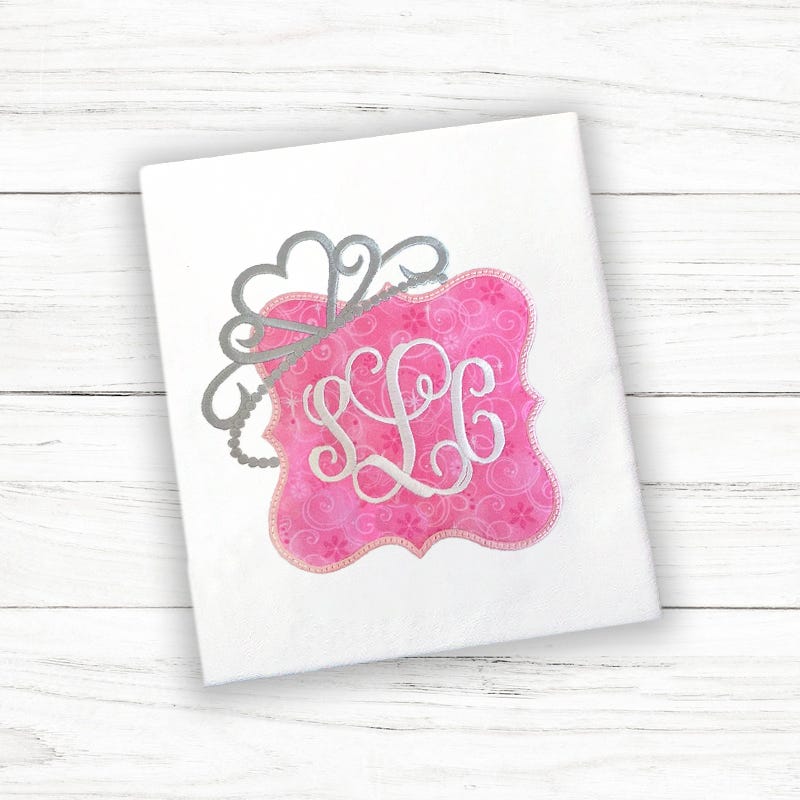 - A frame with an applique tiara (shown personalized with our Curtsy Alphabet)