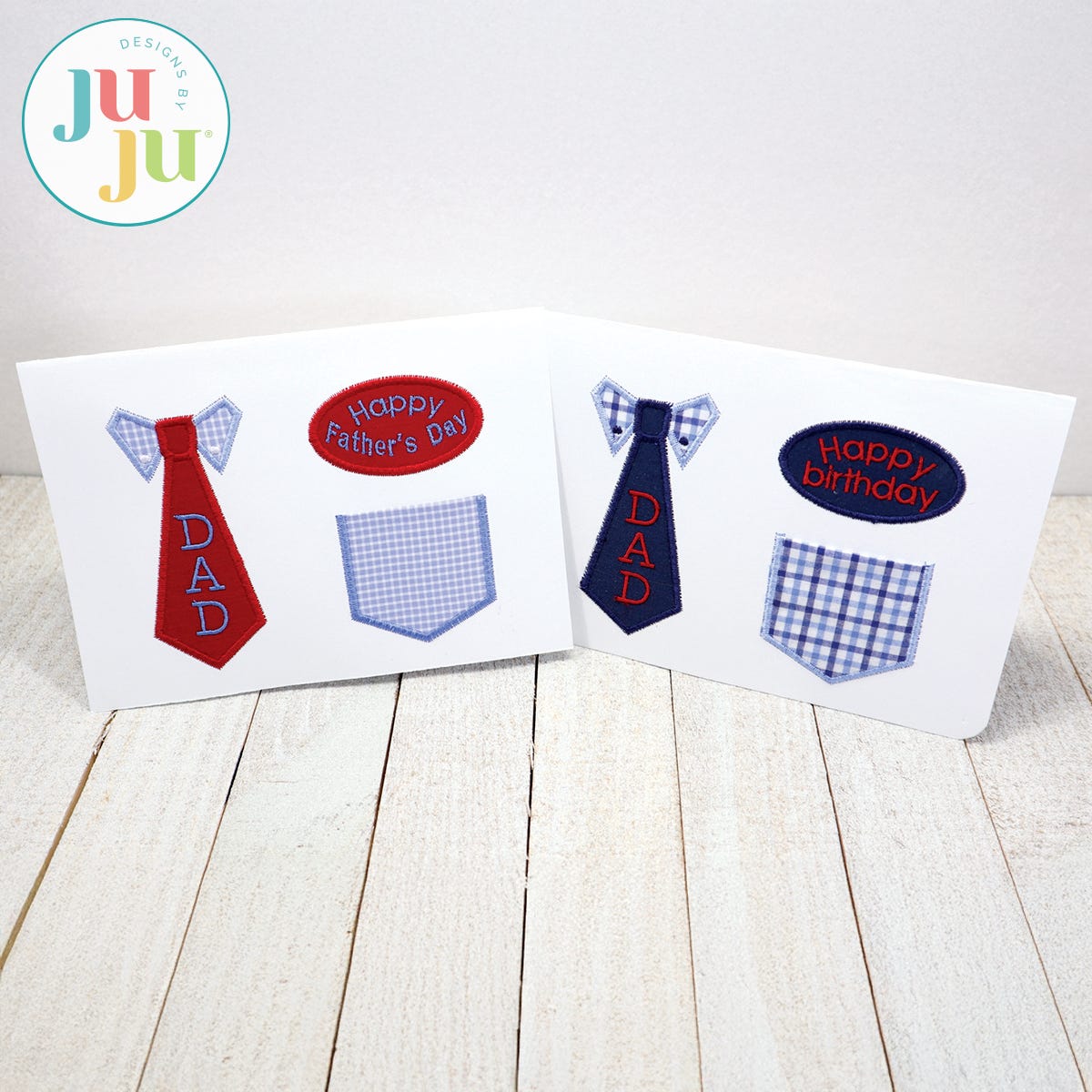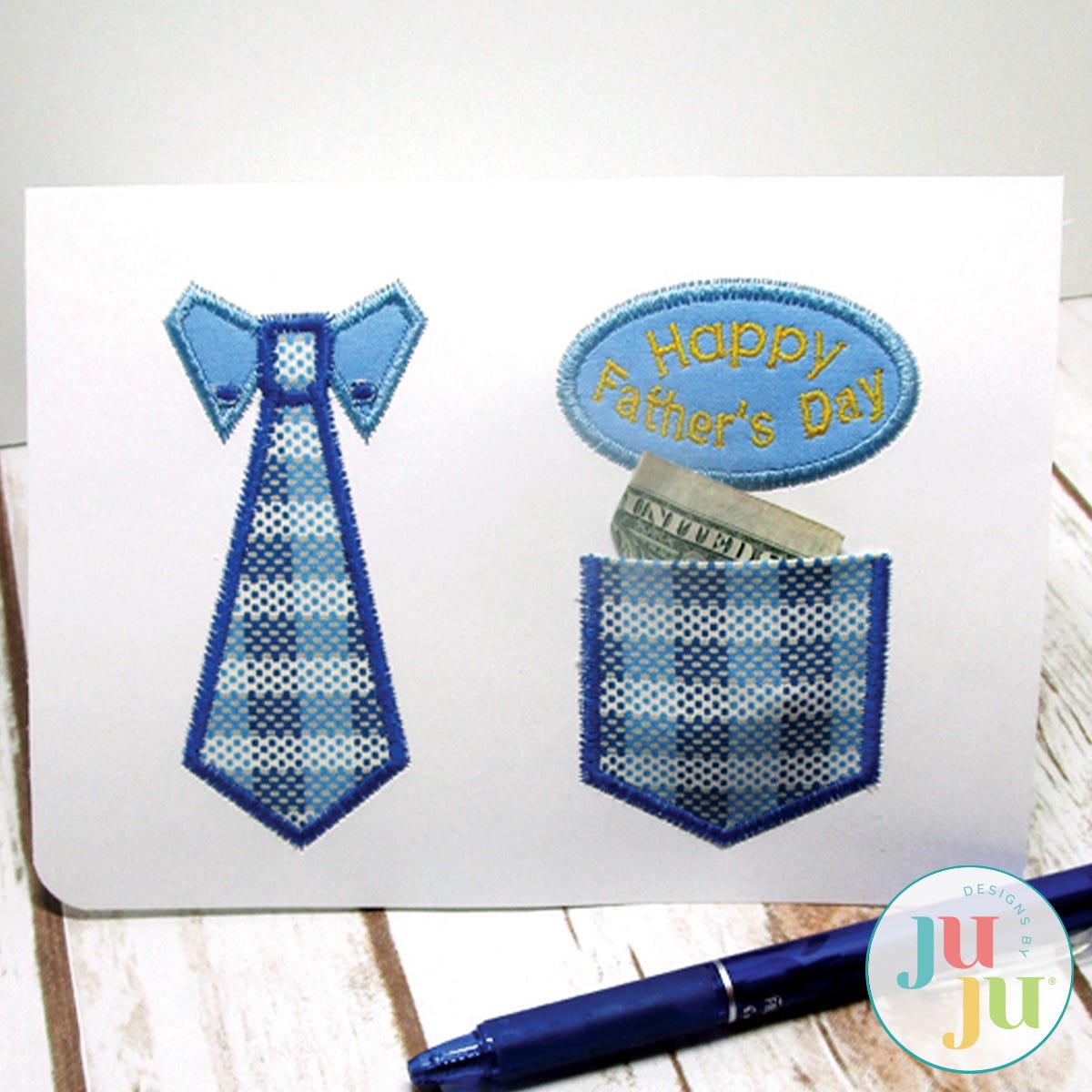 Embroidered greeting cards are fast and fun to make. This card has been digitized to be stitched on cardstock or blank greeting cards. The tie, pocket and label are appliqued (we show you how). The pocket is functional and could be used to insert a folded dollar bill or a faux little hankie. The pocket is not big enough for a gift card.