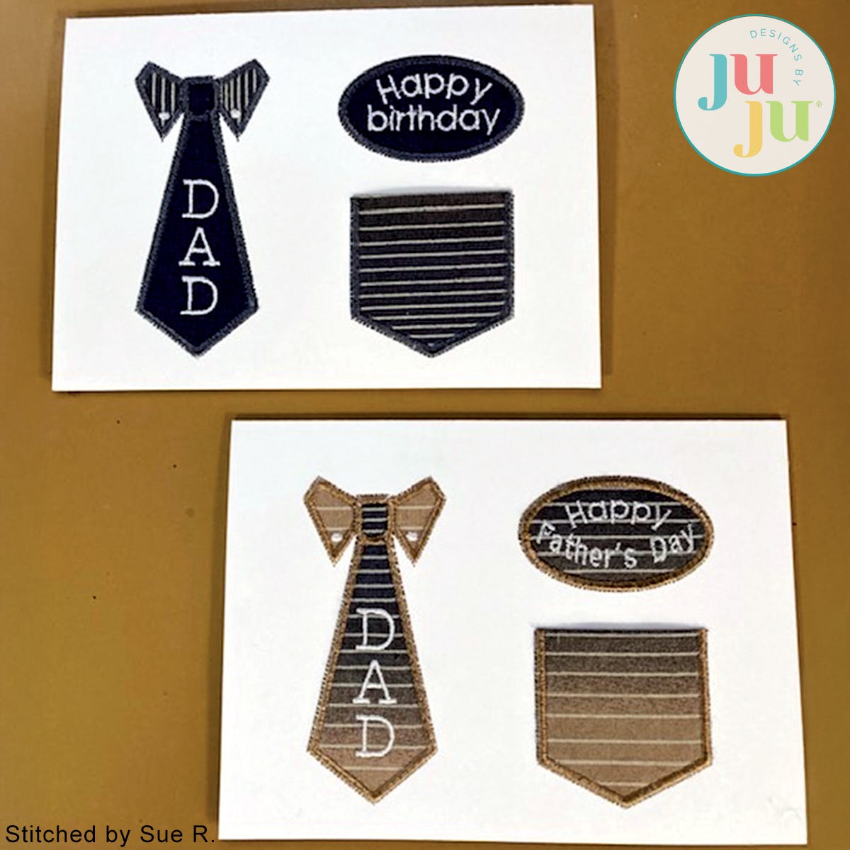 You are receiving a total of 2 stitch files: one version with the words "Happy Birthday" and another with "Happy Father's Day". Both cards come with "Dad" written on the tie. But the word "Dad" can easily be left off by not stitching the last color. We used our 1/2" Classic Block font for "Dad". (Font not included with your purchase. ) If you wish you could insert a short name. The card designs come with placement stitches to ensure accurate placement on the cards. Instructions include tips on stitching on blank cards.