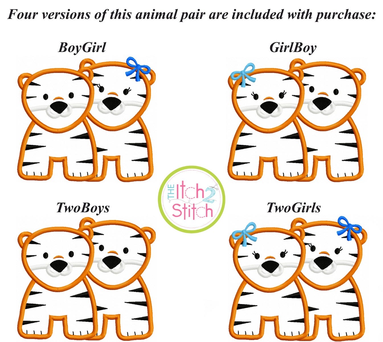 Four different variations of this animal pair are included with purchase (two boys, two girls, boy/girl, girl/boy); the girls have eyelashes and a hairbow, the boys do not.