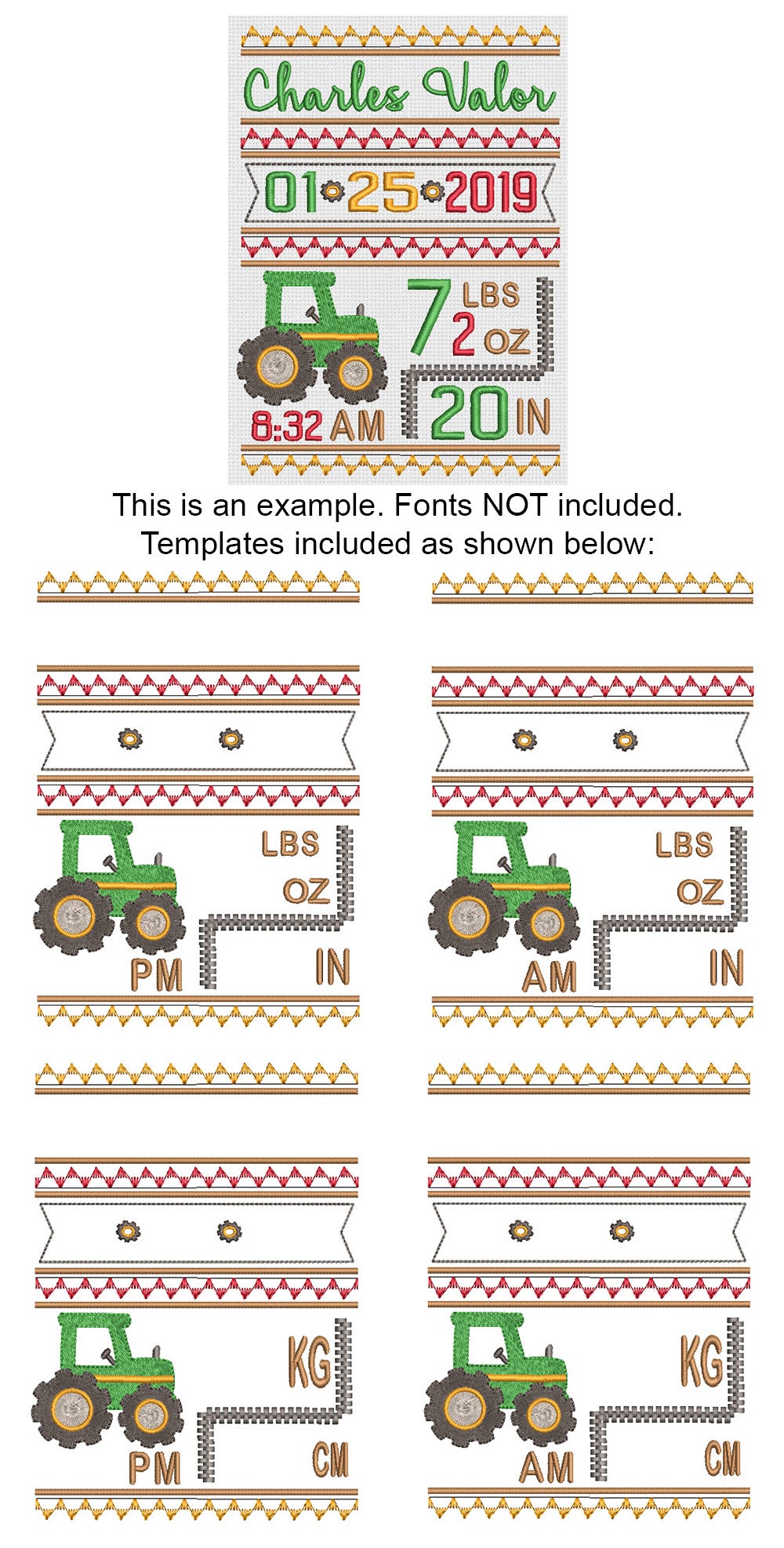 You will receive the embroidery templates shown. Customize with your own names, date, weight and length with fonts from your purchased collection or those that are built in to your embroidery software.Ā I have included a "basting" stitch as the first step so that while you are customizing in your software, you can ensure to stay with the parameters of your hoop. Skip the first step upon stitching.
