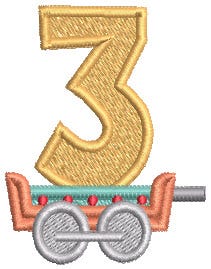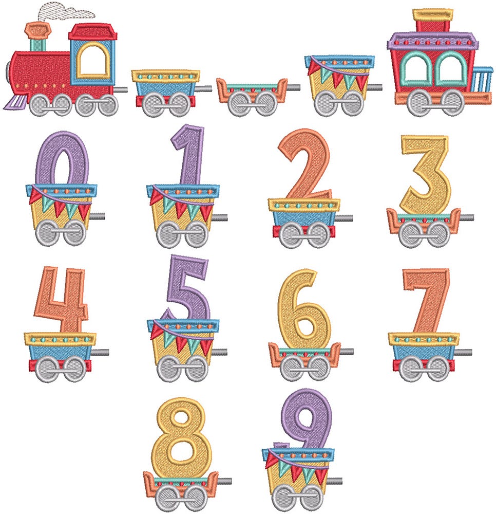 Our Train Number set features fill stitch numbers and cars finished with a satin stitch outline. There is one file per number as pictured. An engine, empty cars, and a caboose are also included to allow you to to build a custom train!