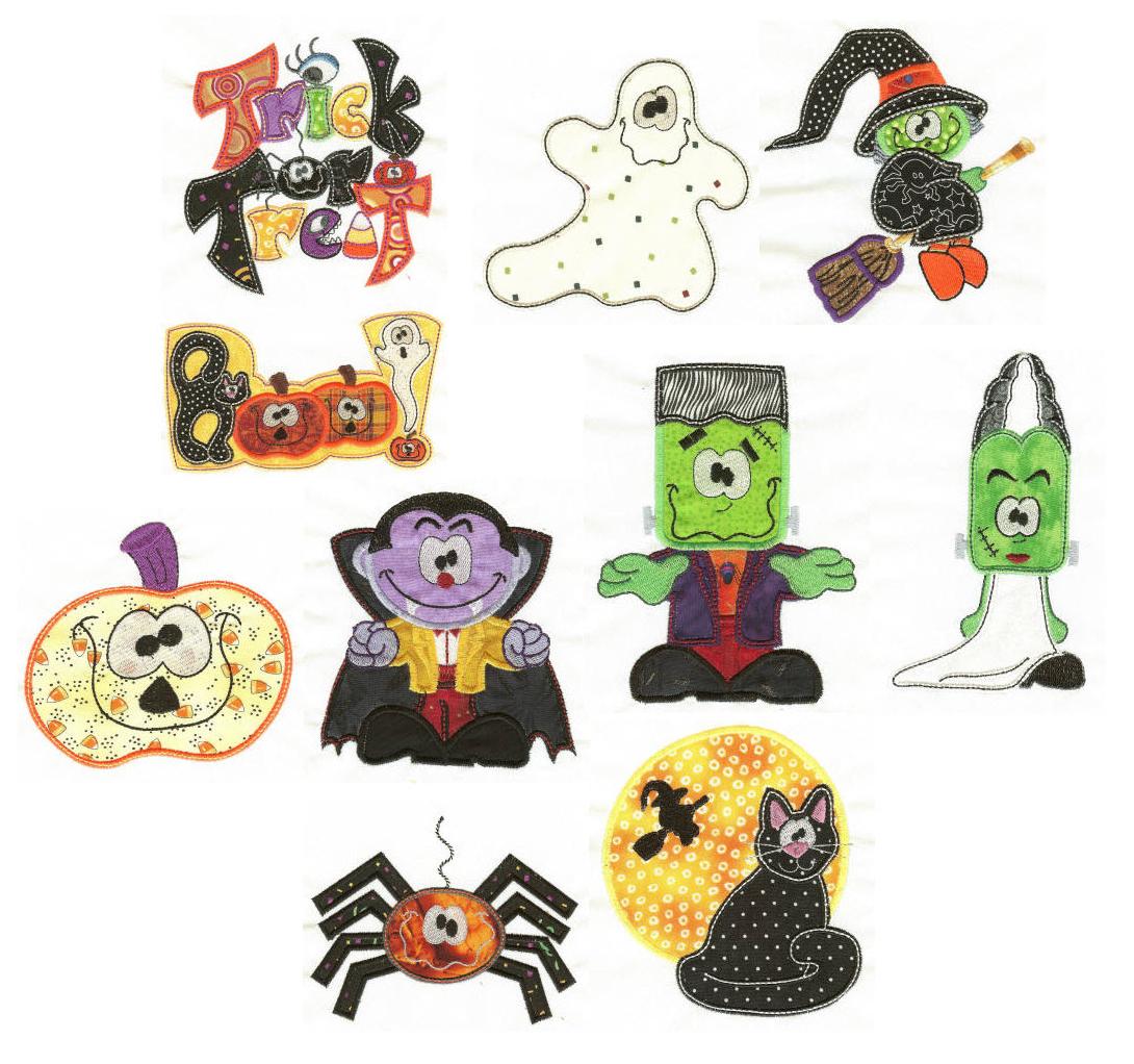 Get ready for some not so spooky halloween sewing with these seriously cute and goofy halloween appliques! Just perfect for trick or treat bags, wall hangings, and that special little boutique halloween outfit..they would be great for a cute pair of boutique overalls!