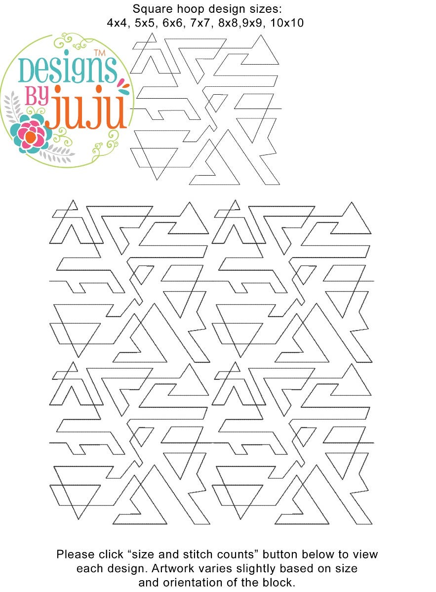Each one of our End-to-End Quilting™ embroidery designs is an originally created design available in a large variety of block sizes. Every block is one continuous single-run line running edge to edge beginning on the left and exiting on the right. There is NO backtracking or double stitching. Each size block has been engineered and manually digitized by our team for EXACT edge-to-edge quilting precision so that when they are aligned properly in your hoop, you cannot tell where one block ends and the next one begins! ADDITIONALLY, the art has been created for each size so that when the rows are stacked on top of each other, it provides a practically seamless, professional, allover quilting effect that mimics (E2E) pantographs so you can do edge-to-edge quilting on your embroidery machine!
