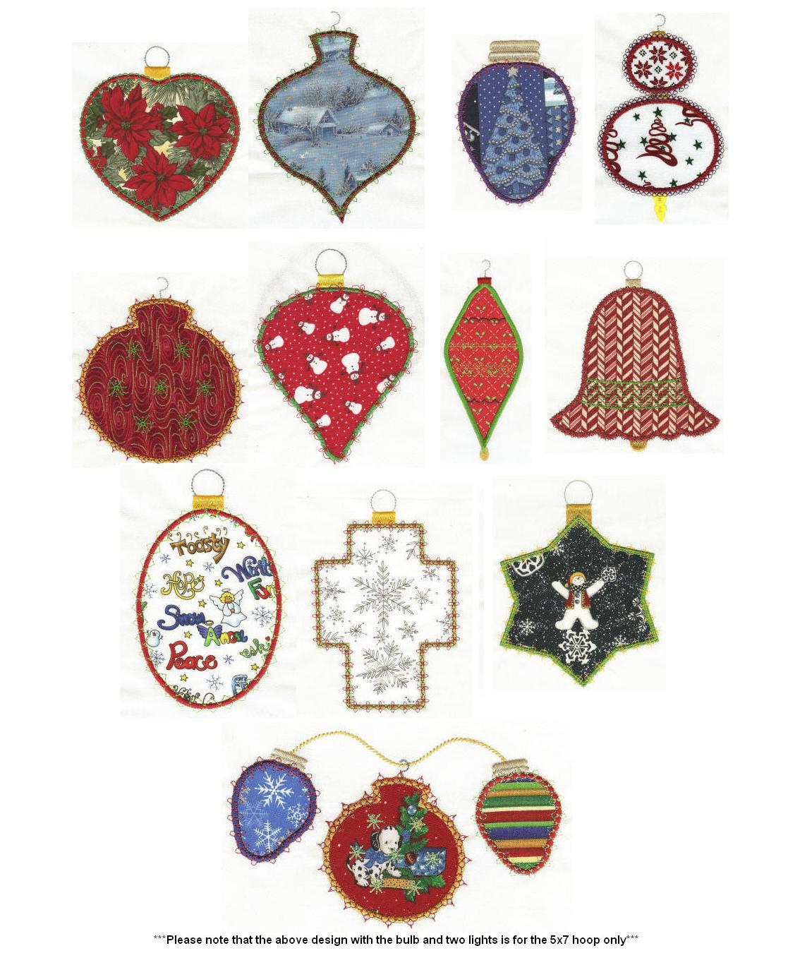 Here are simple and elegant, classic Christmas tree ornaments that will look great on a variety of your holiday projects! They are simple and easy to sew and can really jazz up a plain sweatshirt, towel, bag etc.Ā ***Please note that the design with the bulb and two lights is for the larger 5x7 hoop only..all other designs include both 4x4 and 5x7***