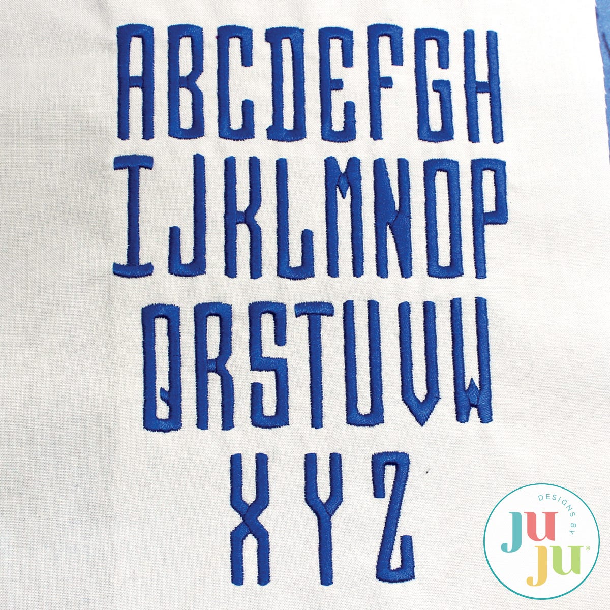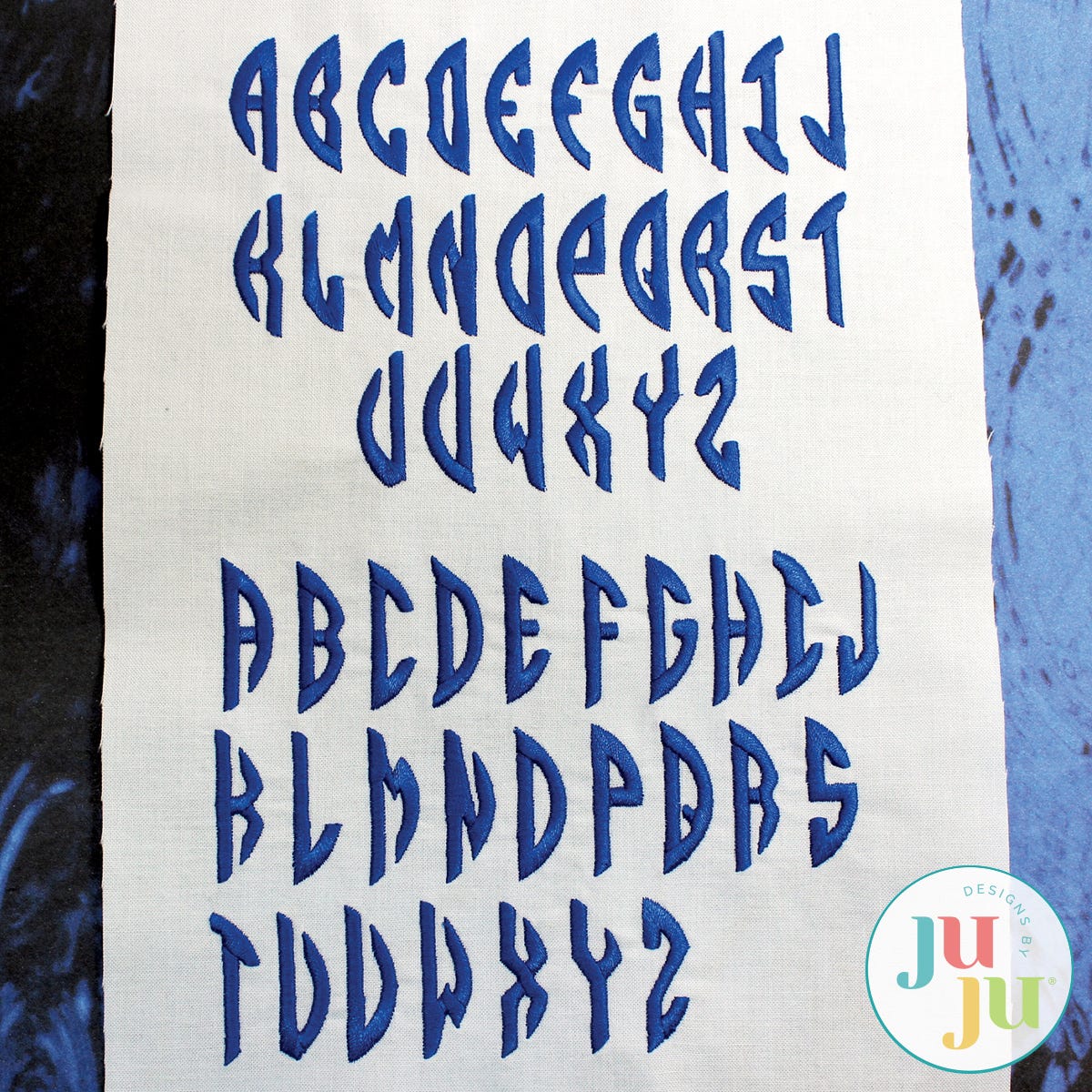 There are three fonts, with capital letters only, in this download: 26 letters each for the center, left and right sides. Bx format is included for Embrilliance users.