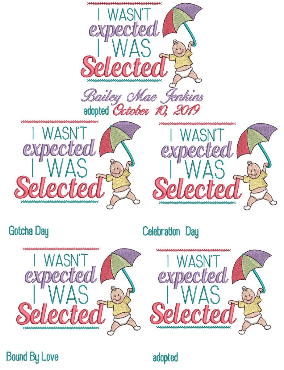 You will receive the embroidery templates shown. Customize with your own names, date, weight and length with fonts from your purchased collection or those that are built in to your embroidery software. Fonts are NOT included with these templates. I have included a "basting" stitch as the first step so that while you are customizing in your software, you can ensure to stay with the parameters of your hoop. Skip the first step upon stitching.
