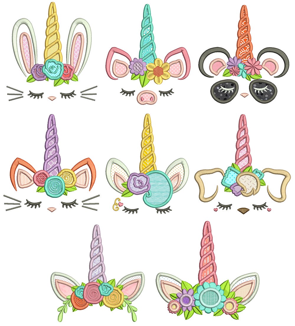8 super sweet "unicorn" animal faces! Each design contains applique components.
