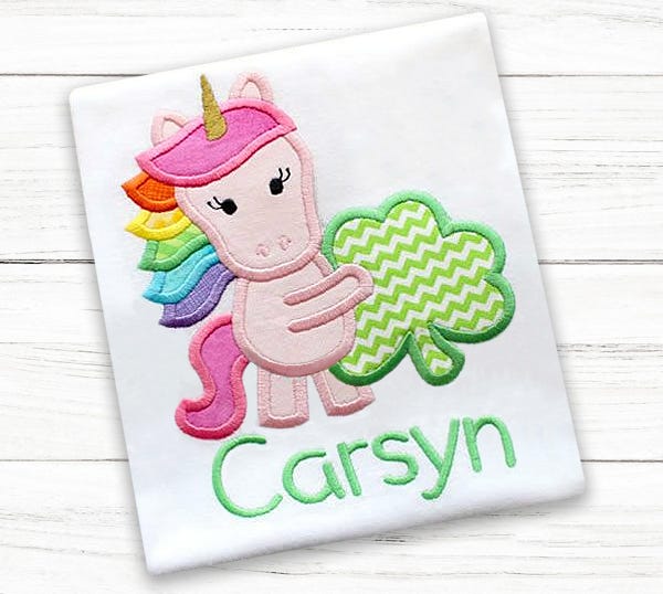 An applique Unicorn with shamrock design perfect for St. Patrick's Day