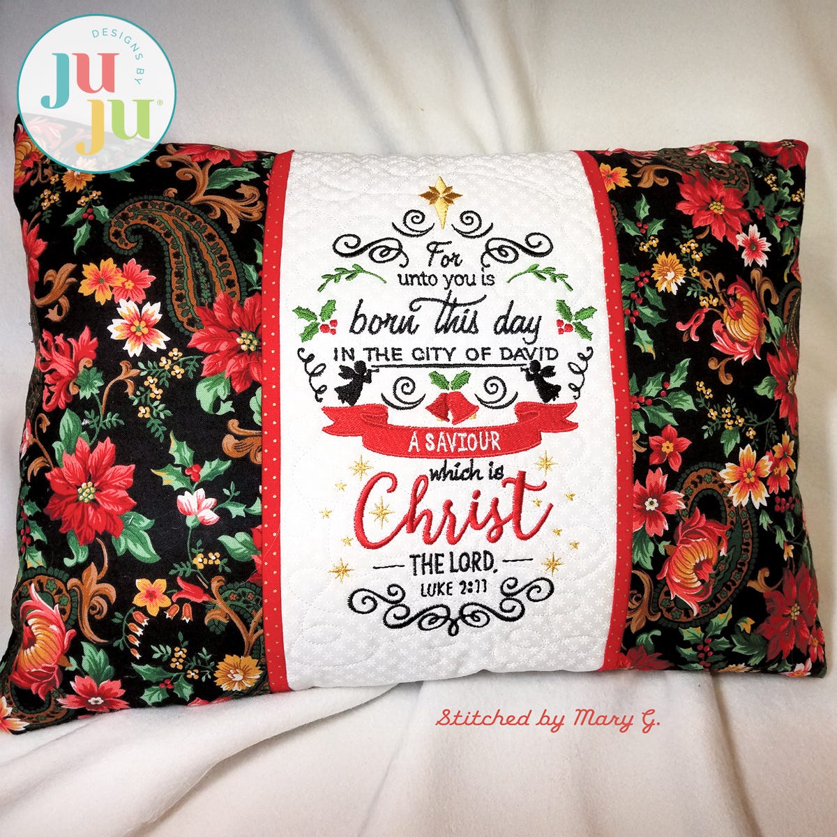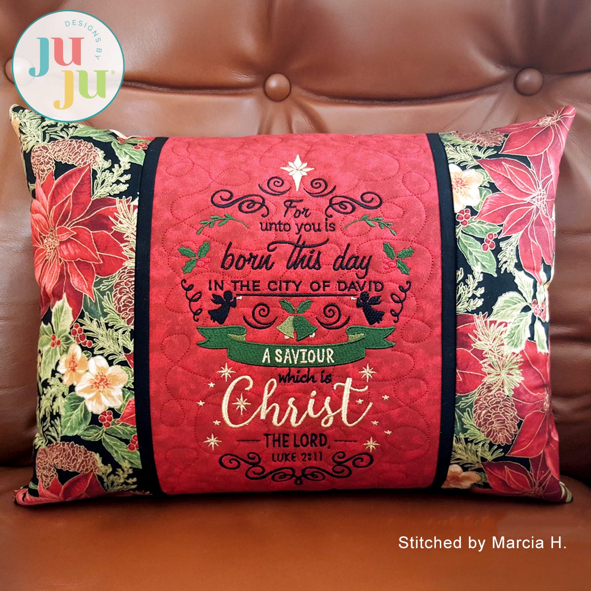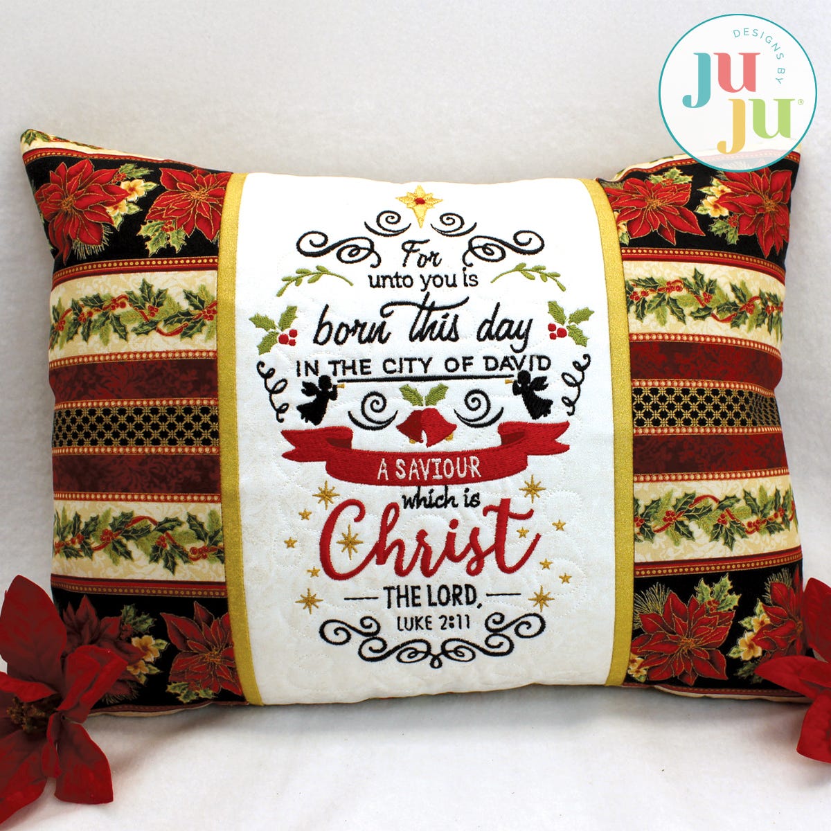 This Christmas pillow is made as a mostly in the hoop project. The background is motif quilted and the contrast strips and borders are applied during the first hooping. The second and third, very quick hoopings, apply the Velcro strips to the back. A small amount of machine stitching is required to complete the pillow.