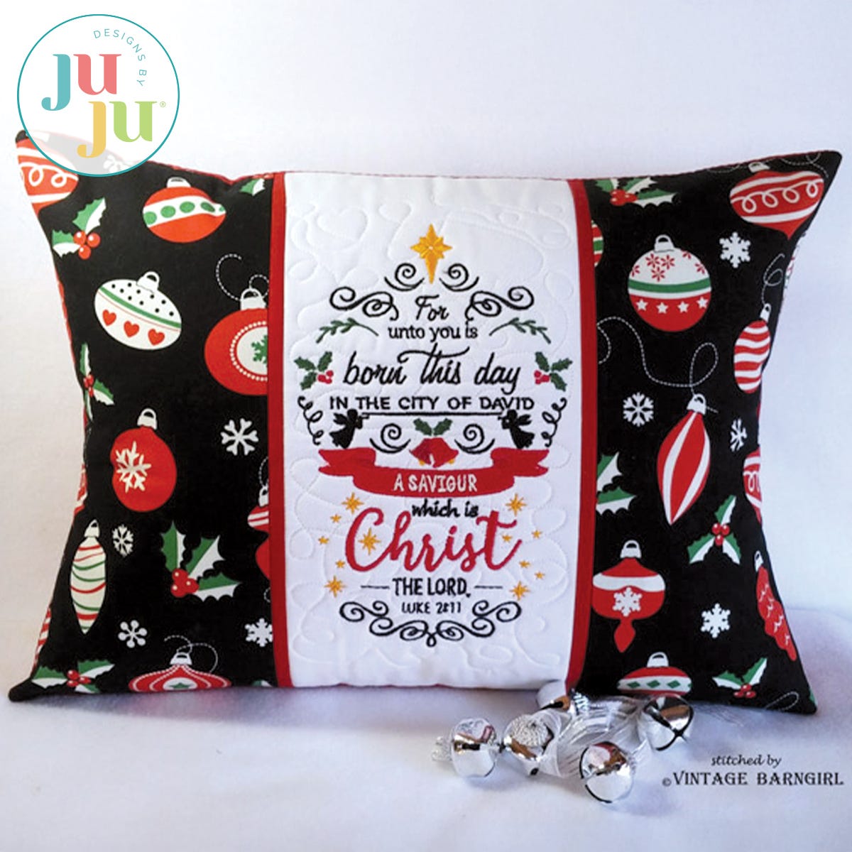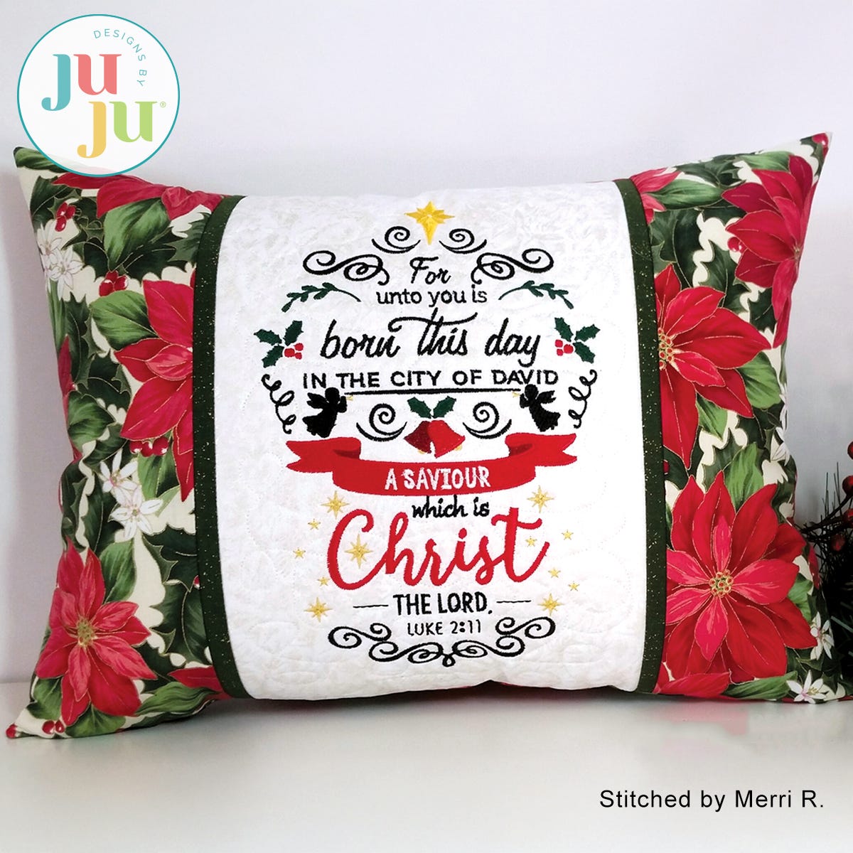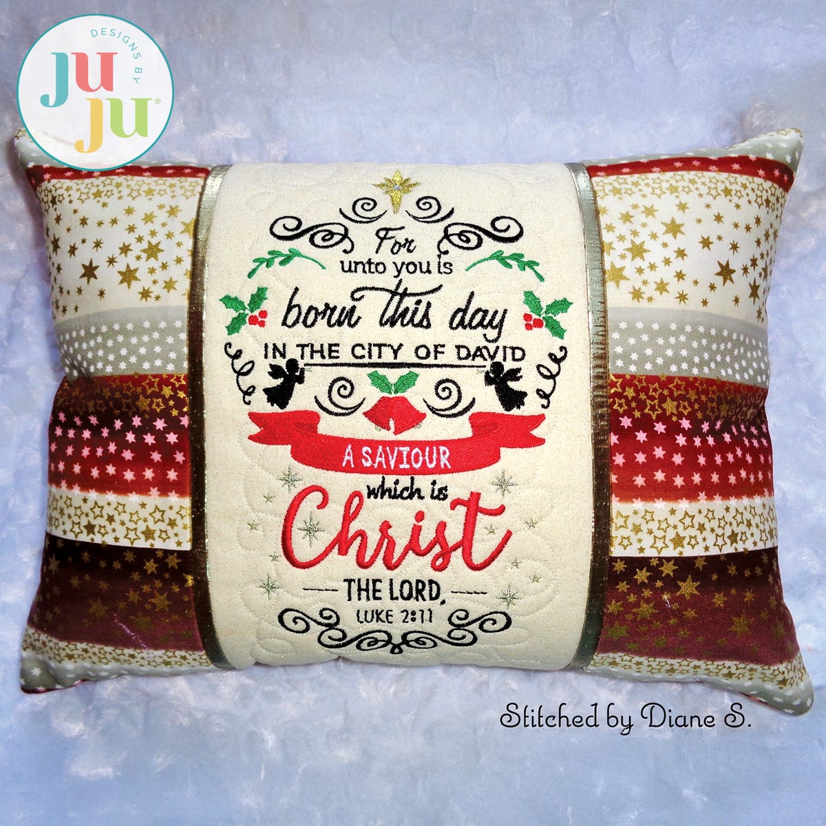 This Christmas pillow is made as a mostly in the hoop project. The background is motif quilted and the contrast strips and borders are applied during the first hooping. The second and third, very quick hoopings, apply the Velcro strips to the back. A small amount of machine stitching is required to complete the pillow.