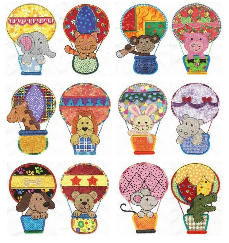 This positively darling applique set of cute animals in hot air balloons is just perfect for baby blankets, clothing, bibs, nursery decor and more! The perfect addition to your collection of children's designs, you are sure to use these again and again!