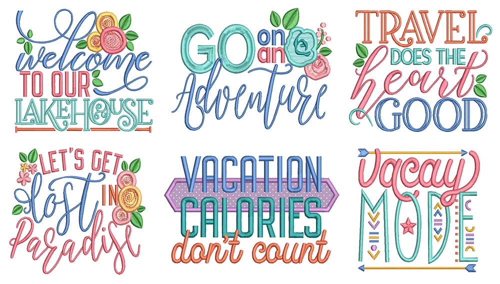 *Please note that the following designs contain applique components:Ā Welcome to our lake house / Go on an adventure / Let's get lost in Paradise / Vacation calories don't countĀ